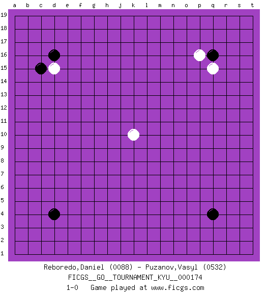 Last move : 1-0 2017 May 21 17:20:47 [Event "FICGS__GO__TOURNAMENT_KYU__000174"] [Site "FICGS"] [Date "2017.04.13"] [Round "1"] [Black "Reboredo,Daniel"] [White "Puzanov,Vasyl"] [Result "1-0"] [Rating 1 "0088"] [Rating 2 "0532"] 1.q16 k10 2.d4 p16 3.q4 q15 4.d16 d15 5.c15 1-0 This go game has been lost on time (started : 2017.04.13 19:39:5) Here are the names of the openings (joseki) played in the four corners : Corner q16 : q16 p16 Hoshi (Hwajeom, Seongjeom, Xingwei`) 4-4 Point. The star or hoshi (4-4) point, emphasizing influence at the potential expense of territory. Corner d16 : d16 d15 Hoshi (Hwajeom, Seongjeom, Xingwei`) 4-4 Point. The star or hoshi (4-4) point, emphasizing influence at the potential expense of territory. Corner d4 : d4 1-0 Hoshi (Hwajeom, Seongjeom, Xingwei`) 4-4 Point. The star or hoshi (4-4) point, emphasizing influence at the potential expense of territory. Player Black won this Go (weiqi, baduk) game. Follow this game move after move (download)A few moments to learn, a lifetime to master. (Ancient proverb) Somehow our devils are never quite what we expect when we meet them face to face. (Nelson DeMille)