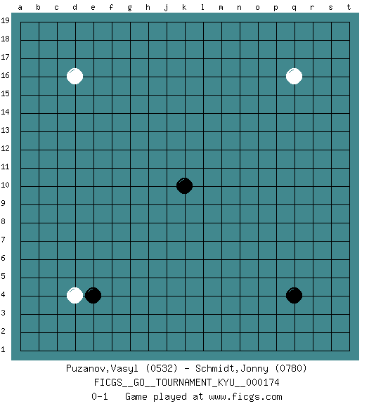 Last move : 0-1 2017 May 17 0:52:42 [Event "FICGS__GO__TOURNAMENT_KYU__000174"] [Site "FICGS"] [Date "2017.04.13"] [Round "1"] [Black "Puzanov,Vasyl"] [White "Schmidt,Jonny"] [Result "0-1"] [Rating 1 "0532"] [Rating 2 "0780"] 1.q4 d4 2.k10 d16 3.e4 q16 0-1 Here are the names of the openings (joseki) played in the four corners : Corner d4 : d4 e4 Hoshi (Hwajeom, Seongjeom, Xingwei`) 4-4 Point. The star or hoshi (4-4) point, emphasizing influence at the potential expense of territory. Player White won this Go (weiqi, baduk) game. Follow this game move after move (download)When you study joseki, you lose two stones in strength. (Anonymous) If you are good, you will be assigned all the work. If you are really good, you will get out of it. (Dan Rotaru)