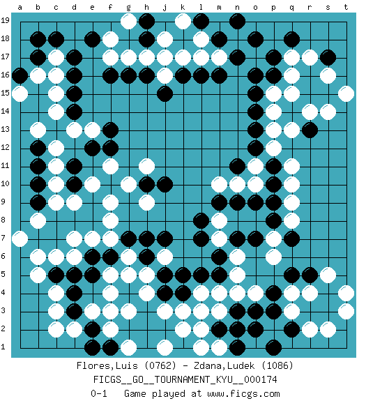Last move : 0-1 2017 September 20 23:29:0 [Event "FICGS__GO__TOURNAMENT_KYU__000174"] [Site "FICGS"] [Date "2017.04.13"] [Round "1"] [Black "Flores,Luis"] [White "Zdana,Ludek"] [Result "0-1"] [Rating 1 "0762"] [Rating 2 "1086"] 1.d4 q16 2.d16 q4 3.p17 q17 4.p16 p15 5.o16 q13 6.o14 p14 7.o15 l17 8.k16 k17 9.l16 h17 10.h16 g17 11.g16 f17 12.f16 c14 13.c13 c17 14.d17 c16 15.d15 c15 16.d14 q10 17.p10 q11 18.p11 p12 19.o12 m17 20.m16 k3 21.k4 l4 22.j4 j3 23.h3 c6 24.c7 d7 25.c8 b5 26.d5 d6 27.d8 f7 28.e6 e7 29.f6 f9 30.d10 c3 31.c5 b6 32.h6 c4 33.d3 d2 34.e2 c2 35.e1 o4 36.l5 m4 37.m5 n5 38.m6 n6 39.n7 p6 40.o7 p7 41.p8 q8 42.p9 q9 43.o13 p13 44.n17 n18 45.o18 j16 46.j15 g3 47.j2 h4 48.h2 l3 49.m2 h5 50.j5 j6 51.k5 g6 52.h7 f5 53.e5 e3 54.g4 g5 55.g7 f4 56.g2 f2 57.f1 f3 58.e8 f8 59.j7 o11 60.n11 m7 61.l7 m8 62.l8 o10 63.o9 n10 64.n9 m10 65.m9 h9 66.e18 f18 67.m18 l18 68.n19 j18 69.l19 k19 70.o2 k2 71.h19 g19 72.k1 l1 73.r3 r4 74.c18 b13 75.s4 s5 76.s3 p2 77.p3 q3 78.q2 r2 79.p1 s2 80.b17 b16 81.r5 t4 82.o3 m1 83.n1 l2 84.b18 c12 85.b11 d13 86.a16 a15 87.e12 e13 88.f12 c11 89.b10 c10 90.b12 c9 91.b9 d9 92.e9 e10 93.d11 b8 94.q7 m3 95.n3 j1 96.b7 a7 97.p4 t3 98.r15 q15 99.s17 r14 100.r13 s14 101.q18 s16 102.f13 h11 103.r16 r17 104.s15 t15 105.h10 g10 106.j10 f11 107.h18 j17 108.q5 n4 109.n2 g1 110.h1 g1 0-1 Here are the names of the openings (joseki) played in the four corners : Corner q16 : q16 p17 Hoshi (Hwajeom, Seongjeom, Xingwei`) 4-4 Point. The star or hoshi (4-4) point, emphasizing influence at the potential expense of territory. Corner d16 : d16 h17 Hoshi (Hwajeom, Seongjeom, Xingwei`) 4-4 Point. The star or hoshi (4-4) point, emphasizing influence at the potential expense of territory. Player White won this Go (weiqi, baduk) game. Follow this game move after move (download)In the sound of the stone you can hear its purpose. (Pierre Audouard) There are three kinds of lies: lies, damned lies and statistics. (Mark Twain)