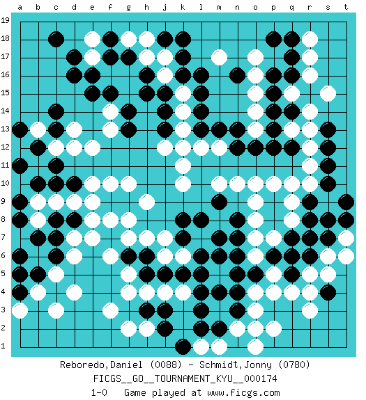 Last move : 1-0 2017 December 31 16:2:45 [Event "FICGS__GO__TOURNAMENT_KYU__000174"] [Site "FICGS"] [Date "2017.04.13"] [Round "1"] [Black "Reboredo,Daniel"] [White "Schmidt,Jonny"] [Result "1-0"] [Rating 1 "0088"] [Rating 2 "0780"] 1.q16 q4 2.d16 d4 3.r6 o3 4.s4 r3 5.r9 o17 6.q14 m17 7.c13 k10 8.c8 h17 9.j3 j7 10.l3 f3 11.c6 e7 12.n4 n10 13.n3 o4 14.n5 r12 15.p12 q10 16.q18 q13 17.p13 r14 18.q12 r13 19.p15 r10 20.r15 s9 21.r8 o6 22.s11 r11 23.s10 o10 24.o5 p5 25.p6 e17 26.e16 n2 27.q5 p4 28.m2 f16 29.f15 g15 30.f17 g16 31.d17 f14 32.e15 e18 33.f18 d9 34.g14 c9 35.g13 p2 36.d8 e8 37.e9 e10 38.f9 b8 39.b7 d7 40.c7 f10 41.g9 g10 42.n6 o7 43.d10 b9 44.c10 h9 45.b10 g8 46.a8 f8 47.a9 e9 48.n1 o2 49.p9 p10 50.k17 k15 51.l16 e12 52.l15 c12 53.b12 k14 54.l14 d13 55.c14 k13 56.j18 o14 57.p14 o15 58.n13 o13 59.o12 r5 60.q6 r4 61.n8 h18 62.n16 o16 63.n12 c5 64.l13 l12 65.t9 s6 66.k12 m12 67.h15 j17 68.k16 r17 69.q17 j12 70.k18 j16 71.j15 b13 72.c11 r7 73.j13 k11 74.q7 q8 75.s7 p7 76.r7 q9 77.j14 t7 78.s8 k12 79.m13 h2 80.j2 s5 81.p8 o8 82.n7 o9 83.s12 t6 84.t8 f13 85.g17 d12 86.a13 g18 87.h16 k6 88.k5 l1 89.l6 m1 90.k1 b11 91.a11 o1 92.l2 s15 93.b5 b4 94.k7 j6 95.h3 g2 96.a4 l7 97.m7 a3 98.a5 c3 99.k8 d6 100.s13 r16 101.a6 l5 102.l8 k4 103.j5 j4 104.h5 h4 105.l4 g4 106.m9 g5 107.h6 h7 108.g6 m5 109.m6 f6 110.m4 q15 111.p16 g7 112.l5 m10 113.p18 r18 114.c18 1-0 Here are the names of the openings (joseki) played in the four corners : Corner q4 : q4 r6 Hoshi (Hwajeom, Seongjeom, Xingwei`) 4-4 Point. The star or hoshi (4-4) point, emphasizing influence at the potential expense of territory. Ikken Kakari (Hankan Keolch'im, Yi Gua`jiao~, 1-Space Low Approach). Black 2 is the standard approach move to the 4-4. Corner q16 : q16 o17 Hoshi (Hwajeom, Seongjeom, Xingwei`) 4-4 Point. The star or hoshi (4-4) point, emphasizing influence at the potential expense of territory. Ikken Kakari (Hankan Keolch'im, Yi Gua`jiao~, 1-Space Low Approach). White 2 is the standard approach move to the 4-4. Corner d4 : d4 c8 Hoshi (Hwajeom, Seongjeom, Xingwei`) 4-4 Point. The star or hoshi (4-4) point, emphasizing influence at the potential expense of territory. Player Black won this Go (weiqi, baduk) game. Follow this game move after move (download)Big groups never die. (Anonymous) Computers make it easier to do a lot of things, but most of the things they make it easier to do don't need to be done. (Andy Rooney)