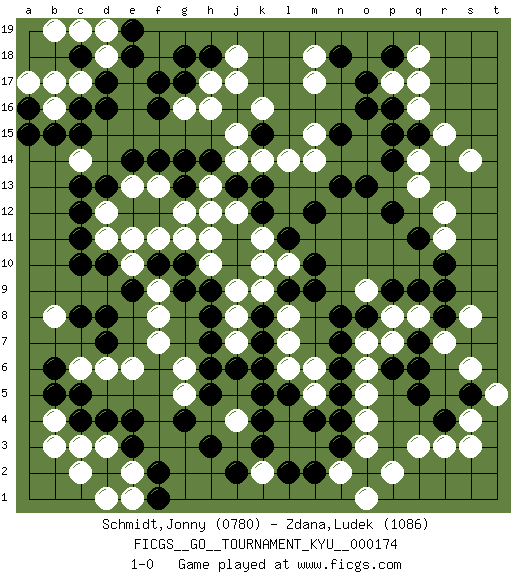 Last move : 1-0 2017 November 6 17:56:54 [Event "FICGS__GO__TOURNAMENT_KYU__000174"] [Site "FICGS"] [Date "2017.04.13"] [Round "1"] [Black "Schmidt,Jonny"] [White "Zdana,Ludek"] [Result "1-0"] [Rating 1 "0780"] [Rating 2 "1086"] 1.d16 q3 2.d4 q16 3.q5 o4 4.h3 m3 5.o17 p17 6.o16 q13 7.r8 s4 8.r10 m17 9.j13 j17 10.c8 c6 11.g17 j15 12.o13 r12 13.p12 m15 14.c11 c14 15.m12 h16 16.h7 e6 17.d7 d6 18.h5 c3 19.c4 b4 20.b5 b3 21.c5 d3 22.e4 f7 23.e3 e2 24.f2 d1 25.g14 g16 26.f17 c17 27.c16 b16 28.b15 b17 29.c15 d12 30.c12 d11 31.d10 g11 32.f10 f11 33.e14 e10 34.e9 e11 35.c10 f9 36.g10 h11 37.h9 k11 38.k12 h10 39.g9 j9 40.l11 k10 41.l9 j8 42.h8 f8 43.k7 f13 44.f14 h12 45.g13 j12 46.k13 e13 47.d13 g12 48.r4 r3 49.s5 s3 50.p18 q18 51.p16 q17 52.p14 q14 53.n18 m18 54.q11 r11 55.q15 r15 56.p15 s14 57.c13 j7 58.j6 m6 59.k3 o9 60.n8 l10 61.m10 k9 62.p6 l8 63.m9 l7 64.k6 l6 65.k8 g5 66.g4 b8 67.n5 m5 68.m4 l4 69.n4 l3 70.n3 k2 71.j2 j4 72.k4 n2 73.k5 o3 74.l5 o5 75.n6 o6 76.n7 o7 77.o8 p7 78.o2 p2 79.m2 o1 80.l2 p8 81.q9 r7 82.q7 q8 83.q6 s8 84.r9 s6 85.p9 t5 86.d17 b19 87.c18 d18 88.e18 d19 89.k15 k16 90.h6 g6 91.d8 k14 92.b6 c2 93.n15 m14 94.n13 l14 95.h18 j18 96.e19 c19 97.f16 h17 98.g18 h13 99.h14 j14 100.f1 e1 101.a16 a17 102.a15 1-0 Here are the names of the openings (joseki) played in the four corners : Corner q4 : q3 q5 Komoku (Somok, Xiao~mu`) 3-4 Point. The komoku (3-4) point is the traditional corner enclosure move.. Ikken Takagakari (Hankan Nop'dakeolch'im, Yi Gaogua`jiao~, 1-Space High Approach). The 5-4 approach move has become more popular in modern times, as modern Go emphasizes speed and influence. Corner q16 : q16 o17 Hoshi (Hwajeom, Seongjeom, Xingwei`) 4-4 Point. The star or hoshi (4-4) point, emphasizing influence at the potential expense of territory. Ikken Kakari (Hankan Keolch'im, Yi Gua`jiao~, 1-Space Low Approach). Black 2 is the standard approach move to the 4-4. Player Black won this Go (weiqi, baduk) game. Follow this game move after move (download)With only one group, you will win. (Anonymous) The man who strikes first admits that his ideas have given out. (Chinese proverb)