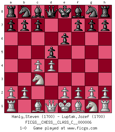 Last move : 1-0 2006 August 8 4:18:43 [Event "FICGS__CHESS__CLASS_C__000006"] [Site "FICGS"] [Date "2006.05.31"] [Round "1"] [White "Hanly,Steven"] [Black "Luptak,Jozef"] [Result "1-0"] [WhiteElo "1700"] [BlackElo "1700"] 1.d4 e6 2.c4 d5 3.Nc3 1-0 This chess game has been lost on time (started : 2006.05.31 8:2:36) Queen's pawn Player White won this chess game. Follow this game move after move (download)Why must I lose to this idiot ? (Aron Nimzovich) Der Vorposten provoziert a) eine Basis für neue Angriffe und b) eine Schwächung der gegnerischen Widerstandskraft in der fraglichen Linie. (Aaron Nimzowitsch) Todos los jugadores de Ajedrez deberían tener un pasatiempo. (Savielly Tartakower) Il (Jacob Murray) ne joue pas pour le bon coup, mais pour le meilleur. (Eloi Relange) It is not titles that honor men, but men that honor titles. (Niccolo Machiavelli)