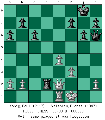 Last move : 0-1 2007 July 1 19:37:41 [Event "FICGS__CHESS__CLASS_B__000020"] [Site "FICGS"] [Date "2007.04.06"] [Round "1"] [White "Konig,Paul"] [Black "Valentin,Florea"] [Result "0-1"] [WhiteElo "2117"] [BlackElo "1847"] 1.d4 Nf6 2.c4 e6 3.Nf3 d5 4.Nc3 c6 5.cxd5 exd5 6.Qc2 g6 7.Bg5 Be7 8.e3 Bf5 9.Bd3 Bxd3 10.Qxd3 Nbd7 11.O-O O-O 12.Rfe1 Re8 13.Rab1 Ne4 14.Bxe7 Qxe7 15.Nd2 Rad8 16.Ndxe4 dxe4 17.Qc2 Nb6 18.Qe2 a6 19.f3 exf3 20.gxf3 Nd5 21.Nxd5 Rxd5 22.Rbd1 Qf6 23.e4 Rxd4 24.Rxd4 Qxd4+ 25.Kh1 Rd8 26.Kg2 Qd2 27.Kf2 Qh6 28.Kf1 Rd2 0-1 Queen's pawn game Kingside Castling by player White (move 11) Kingside Castling by player Black (move 11) Player Black won this chess game. Follow this game move after move (download)I prefer to lose a really good game than to win a bad one. (David Levy) Alle Schachspieler sollten auch ein Hobby haben. (Savielly Grigorievitsch Tartakower) El Ajedrez no es una pizca de inferior al violín, y tenemos un gran número de violinistas profesionales. (Mikhail Botvinnik) Les ravages du H expliquent la différence de niveau entre Tal et Thal [Abergel]. God, you are such an idiot. - Actually, I thought I was more of a jerk. (Gregory House to Stacy Warner, House M.D.)