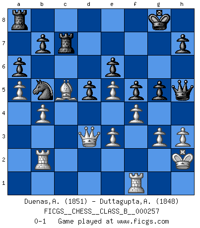 Last move : 0-1 2017 November 27 18:8:30 [Event "FICGS__CHESS__CLASS_B__000257"] [Site "FICGS"] [Date "2017.04.20"] [Round "1"] [White "Duenas,Alexis"] [Black "Duttagupta,Aniruddha"] [Result "0-1"] [WhiteElo "1851"] [BlackElo "1848"] 1.d4 d5 2.c4 c6 3.Nf3 Nf6 4.e3 Bf5 5.Nc3 a6 6.Qb3 Ra7 7.a4 e6 8.a5 Nbd7 9.Nh4 Be4 10.cxd5 Bxd5 11.Nxd5 cxd5 12.Nf3 Bd6 13.Bd3 Nb8 14.Bd2 Nc6 15.O-O Ne4 16.Be1 f5 17.Ne5 Bxe5 18.dxe5 Nc5 19.Qc2 Nxd3 20.Qxd3 O-O 21.f4 Qd7 22.Rb1 R7a8 23.Bc3 Rfc8 24.b4 Qd8 25.h3 Na7 26.Bd4 Nb5 27.Bc5 Qh4 28.Kh2 Rc7 29.g3 Qh5 30.Rb2 g5 0-1 QGD Slav : 4.e3 Bf5 Kingside Castling by player White (move 15) Kingside Castling by player Black (move 20) Player Black won this chess game. Follow this game move after move (download)Every Chess master was once a beginner. (Chernev) Bis zum Jahr 1971 verlief in meiner Schachkariere alles glatt. Dieses dramatische Match [Fischer-Taimanov 6:0] machte mein Leben zur Hölle. (Mark Taimanov) No hay otro maestro que tenga una voluntad terrífica de ganar. Al tablero, el irradía peligro y aún los oponentes mas fuertes tienden a congelarse como liebres cuando olfatean a una pantera. Aún sus debilidades son peligrosas. Con las blancas, su juego de apertura es predecible - te es posible hacer planes en su contra - pero es tan fuerte que tus planes casi nunca funcionan. En el juego medio, su precisión e invención son fabulosas y en finales, tú simplemente no le puedes vencer. (Experto Alemán anónimo) Le thème de l'attaque double intervient d'une manière ou d'une autre dans l'immense majorité des combinaisons. (Youri Averbakh) Quotation,n.: The act of repeating erroneously the words of another. The words erroneously repeated. (Ambrose Bierce, The Devil's Dictionary)