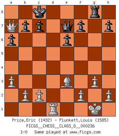 Last move : 1-0 2017 August 14 16:14:49 [Event "FICGS__CHESS__CLASS_D__000236"] [Site "FICGS"] [Date "2017.04.21"] [Round "1"] [White "Price,Eric"] [Black "Plunkett,Louis"] [Result "1-0"] [WhiteElo "1432"] [BlackElo "1585"] 1.e4 Nc6 2.d4 d5 3.exd5 Qxd5 4.Nf3 Nf6 5.Nc3 Qd8 6.Be2 Bg4 7.Be3 e6 8.O-O a6 9.a3 Qd6 10.Qd2 O-O-O 11.Rfd1 Qd7 12.Qe1 Kb8 13.Ne5 Nxe5 14.dxe5 Qc8 15.exf6 Bxe2 16.Qxe2 gxf6 17.Rxd8 Qxd8 18.Rd1 Qc8 19.Ne4 Be7 20.Qf3 Qf8 21.Nxf6 Bxf6 22.Qxf6 Rg8 23.g3 Kc8 24.Qd4 Qe7 25.Qa7 1-0 KP : Nimzovich defense Kingside Castling by player White (move 8) Queenside Castling by player Black (move 10) Player White won this chess game. Follow this game move after move (download)When I have White, I win because I am white; When I have Black, I win because I am Bogolyubov. (Bogolyubov) Schach ist Kampf, hauptsächlich jedoch gegen die eigenen Fehler. (Savielly Grigorievitsch Tartakower) Yo jugué Ajedrez con el y a veces le pude haber ganado solo que siempre devuelve su última jugada y juega la partida de manera diferente. (Mark Twain) Les Echecs sont et restent toujours un combat, un combat intégral comme la boxe, la lutte ou un autre sport, et où il doit y avoir un vainqueur et un vaincu. (Joseph Emil Diemer) Think like a man of action, act like a man of thought. (Henri Louis Bergson)