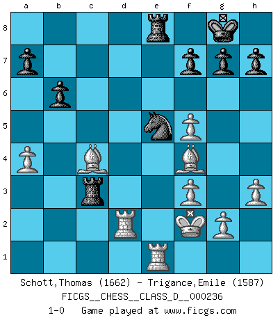 Last move : 1-0 2017 June 7 7:56:52 [Event "FICGS__CHESS__CLASS_D__000236"] [Site "FICGS"] [Date "2017.04.21"] [Round "1"] [White "Schott,Thomas"] [Black "Trigance,Emile"] [Result "1-0"] [WhiteElo "1662"] [BlackElo "1587"] 1.d4 d5 2.c4 dxc4 3.e4 e5 4.Nf3 Bb4+ 5.Nc3 exd4 6.Nxd4 Ne7 7.Bxc4 Nbc6 8.Be3 O-O 9.a3 Bxc3+ 10.bxc3 Na5 11.Be2 Ng6 12.O-O Qe7 13.Qc2 Ne5 14.Rfe1 b6 15.Nf5 Bxf5 16.exf5 Rfe8 17.a4 Rad8 18.h3 Nec4 19.Bf4 Qe4 20.Qxe4 Rxe4 21.Bxc7 Rde8 22.Ra2 Nb7 23.Bg3 Nbd6 24.f3 Re3 25.Bf4 Rxc3 26.Kf2 Ne5 27.Rd2 Ndc4 28.Bxc4 1-0 QGA : 3.e4 Kingside Castling by player Black (move 8) Kingside Castling by player White (move 12) Player White won this chess game. Follow this game move after move (download)In Fischer's hands, a slight theoretical advantage is as good a being a Queen ahead. (Isaac Kashdan) Im Spitzenschach von heute geht es nur um Vorbereitung, um tiefgründige, sorgfältige Eröffnungsvorbereitung. (Nigel Short) Un buen sacrificio es aquel que aunque no sea necesariamente sólido, deja a tu oponente aturdido y confuso. (Rudolph Spielmann) Un millionnaire : 'Monsieur Steinitz ! Vous ne participez aux tournois que pour l'argent, alors que moi je n'y viens que pour l'honneur.' Steinitz : 'Chacun joue pour ce qu'il n'a pas'... Now be brave and don't look back. Don't look back. (Shmi Skywalker in Star Wars ep.1)
