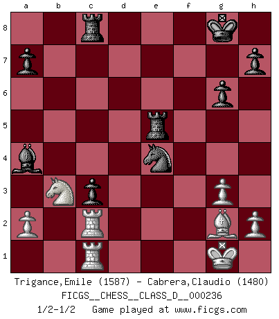 Last move : 1/2-1/2 2017 May 19 17:35:48 [Event "FICGS__CHESS__CLASS_D__000236"] [Site "FICGS"] [Date "2017.04.21"] [Round "1"] [White "Trigance,Emile"] [Black "Cabrera,Claudio"] [Result "1/2-1/2"] [WhiteElo "1587"] [BlackElo "1480"] 1.b4 e5 2.Bb2 f6 3.e4 Nc6 4.b5 Nd4 5.f4 d5 6.d3 Bd7 7.fxe5 c5 8.bxc6 Nxc6 9.exd5 Nxe5 10.Bxe5 fxe5 11.Qh5+ g6 12.Qxe5+ Qe7 13.d4 Bg7 14.Qxe7+ Nxe7 15.Nf3 Nxd5 16.Kf2 Rc8 17.c4 Nb4 18.Nbd2 Nc2 19.Rb1 b5 20.d5 O-O 21.Bd3 Nd4 22.Rhc1 Bh6 23.Rd1 Bxd2 24.Rxd2 bxc4 25.Bf1 Nb5 26.Rc1 c3 27.Rdc2 Nd6 28.Kg1 Ne4 29.Nd4 Ba4 30.Nb3 Rfd8 31.g3 Rxd5 32.Bg2 Re5 1/2-1/2 Polish (Sokolsky) opening Kingside Castling by player Black (move 20) This chess game ended in a draw. Follow this game move after move (download)By the beauty of his games, the clarity of his play, and the brilliance of his ideas, Fischer made himself an artist of the same stature as Brahms, Rembrandt, and Shakespeare. (David Levy) Rubinstein ist ein Turmendspiel, welches die Götter vor tausenden von Jahren begannen. (Savielly Grigorievitsch Tartakower) No soy una persona materialista y por eso, no resiento la falta o pérdida del dinero. La ausencia de cosas mundanas carece de importancia. Ya que el Ajedrez es una forma en la que puedo ser tan materialista como yo desee sin tener la necesidad de vender mi alma. (Jamie Walter Adams) A ce moment-là, je menaçais de comprendre la position ! (Clément L'Heureux) In fact if nothing is done against this teddy bear, hereby I announce that I would quit chess, rapid chess, blitz chess, postal chess, email chess, server chess and correspondence chess I will then switch to a table game where teddy bears aren't going to be seen for a while, like Poker, or Roulette, all 18+ games. (Elmer Valderrama)