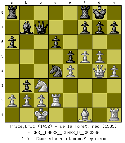 Last move : 1-0 2017 August 3 1:5:4 [Event "FICGS__CHESS__CLASS_D__000236"] [Site "FICGS"] [Date "2017.04.21"] [Round "1"] [White "Price,Eric"] [Black "de la Foret,Fred"] [Result "1-0"] [WhiteElo "1432"] [BlackElo "1585"] 1.e4 c5 2.Nf3 d6 3.d4 cxd4 4.Nxd4 Nf6 5.Nc3 a6 6.Bg5 e6 7.f4 Be7 8.Qf3 O-O 9.O-O-O Qc7 10.g4 b5 11.Bxf6 Bxf6 12.g5 Bxd4 13.Rxd4 Nc6 14.Rd2 Bb7 15.h4 b4 16.Nd1 e5 17.f5 Nd4 18.Qg4 b3 19.Nc3 1-0 This chess game has been lost on time (started : 2017.04.21 14:28:46) Sicilian : Najdorf, 7...Be7 Kingside Castling by player Black (move 8) Queenside Castling by player White (move 9) Player White won this chess game. Follow this game move after move (download)There just isn't enough televised Chess. (David Letterman) Eine Person mit durchschnittlichem IQ kann etwa eine ELO von 2000 erreichen. (Jonathan Levitt) Un sacrificio se refuta mucho mejor al aceptarlo. (Wilhelm Steinitz) Le plus grand jeu de l'esprit jamais inventé, plus vous l'apprenez, plus vous y prenez du plaisir. (Garry Kasparov) Wisdom doesn't necessarily come with age. Sometimes age just shows up all by itself. (Tom Watson)