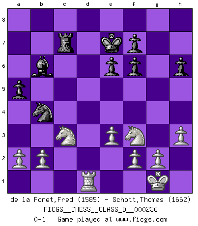Last move : 0-1 2017 September 1 18:27:43 [Event "FICGS__CHESS__CLASS_D__000236"] [Site "FICGS"] [Date "2017.04.21"] [Round "1"] [White "de la Foret,Fred"] [Black "Schott,Thomas"] [Result "0-1"] [WhiteElo "1585"] [BlackElo "1662"] 1.d4 Nf6 2.Bg5 d5 3.e3 c5 4.Bxf6 gxf6 5.dxc5 e6 6.c4 dxc4 7.Qxd8+ Kxd8 8.Bxc4 Nc6 9.Nf3 Bxc5 10.O-O Bd7 11.Rd1 Ke7 12.Nc3 Rhd8 13.Be2 a6 14.Ne4 Bb6 15.Nd6 Be8 16.Nxb7 Rxd1+ 17.Rxd1 Ra7 18.Nd6 Bd7 19.Ne4 Nb4 20.Nc3 a5 21.Nd2 Bc6 22.Bf3 Bxf3 23.Nxf3 h6 24.h3 Rc7 0-1 This chess game has been lost on time (started : 2017.04.21 14:28:46) Trompowsky attack (Ruth, Opovcensky Opening) Kingside Castling by player White (move 10) Player Black won this chess game. Follow this game move after move (download)If Chess is a science, it's a most inexact one. If Chess is an art, it is too exacting to be seen as one. If Chess is a sport, it's too esoteric. If Chess is a game, it's too demanding to be just a game. If Chess is a mistress, she's a demanding one. If Chess is a passion, it's a rewarding one. If Chess is life, it's a sad one. (Unknown) Später, ... hatte ich zunehmend Erfolg in entscheidenden Partien. Vielleicht weil ich eine einfache Wahrheit erkannte: nicht nur ich hatte Angst, auch mein Gegner. (Mikhail Nekhemyevich Tal) El Ajedrez es como la guerra en un tablero. (Bobby Fischer) Les réformistes prétendent que les progrès de la théorie conduiront à la disparition des échecs, et qu'il faut, pour leur rendre vie, en remanier les règles. En réalité, qu'exprime cette affirmation? Le mépris de l'intuition, de l'imagination et de tous les autres éléments qui font des échecs un art. (Alexander Alekhine) Knowledge rests not upon truth alone, but upon error also. (Carl G. Jung)