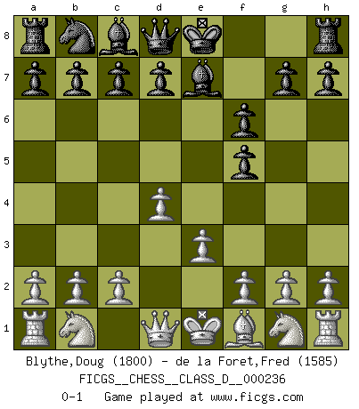 Last move : 0-1 2017 June 1 19:49:7 [Event "FICGS__CHESS__CLASS_D__000236"] [Site "FICGS"] [Date "2017.04.21"] [Round "1"] [White "Blythe,Doug"] [Black "de la Foret,Fred"] [Result "0-1"] [WhiteElo "1800"] [BlackElo "1585"] 1.d4 f5 2.Bg5 Nf6 3.Bxf6 exf6 4.e3 Be7 0-1 This chess game has been lost on time (started : 2017.04.21 14:28:46) Dutch, 2.Bg5 variation Player Black won this chess game. Follow this game move after move (download)Nowadays, when you're not a grandmaster at 14, you can forget about it. (Anand Viswanathan) Nie in meinem Leben habe ich die französische Verteidigung gespielt, welche die Stumpfsinnigste von allen ist. (Wilhelm Steinitz) Me gusta decir que Bobby Fischer fue el mejor jugador que jamás haya existido. Pero lo que hizo de Fischer un genio, fue su habilidad de mezclar una frescura y pragmatismo Americano con ideas Rusas acerca de la estrategia. (Bruce Pandolfini) Lorsque vous vous retrouvez devant une position atroce, ne tendez pas un ultime piège dérisoire avec l'intention d'abandonner si l'adversaire le déjoue ! Faites-vous plutôt un devoir de résister comme si votre vie en dépendait. Jouez le coup qui vous déplairait au centuple si vous étiez dans la peau de votre tortionnaire ! It is a good thing for an uneducated man to read books of quotations. (Winston Churchill)
