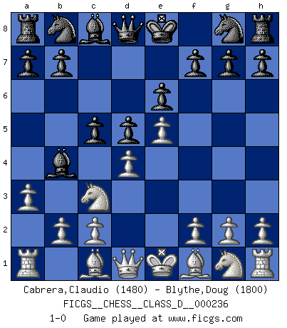 Last move : 1-0 2017 June 1 19:49:7 [Event "FICGS__CHESS__CLASS_D__000236"] [Site "FICGS"] [Date "2017.04.21"] [Round "1"] [White "Cabrera,Claudio"] [Black "Blythe,Doug"] [Result "1-0"] [WhiteElo "1480"] [BlackElo "1800"] 1.d4 e6 2.e4 d5 3.Nc3 Bb4 4.e5 c5 5.a3 1-0 This chess game has been lost on time (started : 2017.04.21 14:28:46) Queen's pawn Player White won this chess game. Follow this game move after move (download)It is the aim of the modern school, not to treat every position according to one general law, but according to the principle inherent in the position. (Richard Reti) Ich rechne überhaupt nicht voraus. Ich gewinne auch so. (Robert James Fischer) Por la belleza de sus partidas, la claridad de su juego y lo brillante de sus ideas, Fischer se creó el mismo como un artista de la misma estatura como Brahms, Rembrandt y Shakespeare. (David Levy) L'ordinateur a tué l'originalité. Il n'y a plus guère d'aventures sur l'échiquier. (Jacob Murray) Secret operations are essential in war; upon them the army relies to make its every move. (Sun Tzu)