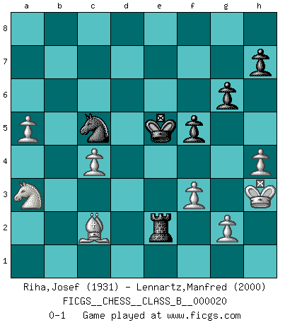 Last move : 0-1 2007 July 20 10:28:50 [Event "FICGS__CHESS__CLASS_B__000020"] [Site "FICGS"] [Date "2007.04.06"] [Round "1"] [White "Riha,Josef"] [Black "Lennartz,Manfred"] [Result "0-1"] [WhiteElo "1931"] [BlackElo "2000"] 1.d4 Nf6 2.c4 e6 3.Nc3 Bb4 4.e3 O-O 5.Bd3 c5 6.Nge2 d5 7.cxd5 cxd4 8.exd4 Nxd5 9.O-O Nc6 10.Bc2 Re8 11.Qd3 g6 12.a3 Be7 13.Qf3 Nxc3 14.bxc3 Bd7 15.Bf4 Bf6 16.Rad1 Rc8 17.Bh6 e5 18.dxe5 Nxe5 19.Qxb7 Rc7 20.Qa6 Rc6 21.Qxa7 Rc7 22.Qa6 Rc6 23.Qa4 Qc8 24.f3 Rc4 25.Qb3 Qc5+ 26.Kh1 Be6 27.Qb1 Rh4 28.Qc1 Bc4 29.Rde1 Qc7 30.h3 Qb7 31.Ng3 Bxf1 32.Rxf1 Be7 33.Bg5 Bxg5 34.Qxg5 Qe7 35.Qxe7 Rxe7 36.Ne4 Nd7 37.Kh2 Rh5 38.Rb1 Rhe5 39.c4 Kg7 40.a4 f5 41.Nc3 Re1 42.Rb7 Nf6 43.Rxe7+ Rxe7 44.h4 Re3 45.Nb5 Nd7 46.Kg3 Re2 47.Na3 Kf6 48.a5 Nc5 49.Kh3 Ke5 0-1 Nimzo-Indian : 4.e3 O-O, 5.Bd3 Kingside Castling by player Black (move 4) Kingside Castling by player White (move 9) Player Black won this chess game. Follow this game move after move (download)Chess is like life. (Boris Spassky) Ja, ich habe einmal eine Blitzpartie gespielt, es war in einem Zug, 1929. --im Interview 1989 (Mikhail Moiseyevich Botvinik) EL Ajedrez es como la vida. (Boris Spassky) Les échecs, c'est l'art d'analyser. (Mikhail Botvinnik) Life is verb, not a noun. (Charlotte Perkins Gilman)