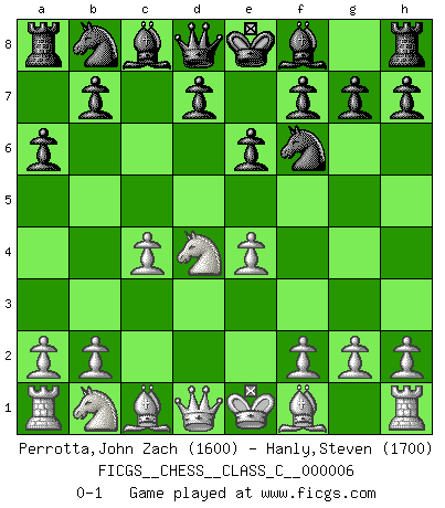 Last move : 0-1 2006 September 5 23:36:14 [Event "FICGS__CHESS__CLASS_C__000006"] [Site "FICGS"] [Date "2006.05.31"] [Round "1"] [White "Perrotta,John Zach"] [Black "Hanly,Steven"] [Result "0-1"] [WhiteElo "1600"] [BlackElo "1700"] 1.e4 c5 2.Nf3 e6 3.d4 cxd4 4.Nxd4 a6 5.c4 Nf6 0-1 This chess game has been lost on time (started : 2006.05.31 8:2:36) Sicilian : Kan, Maroczy bind (Reti variation) Player Black won this chess game. Follow this game move after move (download)Chess is so inspiring that I do not believe a good player is capable of having an evil thought during the game. (Wilhelm Steinitz) Der zweitbeste Zug ist oft der einzig richtige. (Savielly Grigorievitsch Tartakower) EL Ajedrez es como la vida. (Boris Spassky) Si rien de grave n'est détecté lors de l'analyse d'une position, on joue alors le coup. Seconde règle de Blumenfeld. Convictions are more dangerous enemies of truth than lies. (Friedrich Nietzsche)