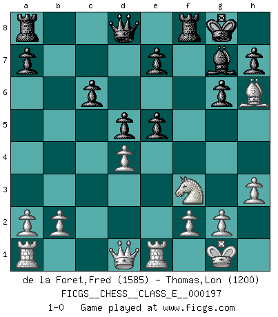 Last move : 1-0 2017 July 3 0:21:0 [Event "FICGS__CHESS__CLASS_E__000197"] [Site "FICGS"] [Date "2017.04.29"] [Round "1"] [White "de la Foret,Fred"] [Black "Thomas,Lon"] [Result "1-0"] [WhiteElo "1585"] [BlackElo "1200"] 1.e4 c5 2.d4 cxd4 3.c3 g6 4.cxd4 d5 5.e5 Bg7 6.Nf3 Bg4 7.Bb5+ Nc6 8.O-O Nh6 9.Bxc6+ bxc6 10.Nbd2 O-O 11.Re1 f6 12.h3 Bxf3 13.Nxf3 fxe5 14.Bxh6 1-0 Sicilian : Smith-Morra gambit Kingside Castling by player White (move 8) Kingside Castling by player Black (move 10) Player White won this chess game. Follow this game move after move (download)Chess is so inspiring that I do not believe a good player is capable of having an evil thought during the game. (Wilhelm Steinitz) Schach ist die gewalttätigste aller Sportarten. (Garry Kasparov) Yo no creo en la psicología. Yo creo en las buenas movidas. (Bobby Fischer) Fischer est le meilleur joueur du monde et Karpov n'est qu'un joueur de bistrot. (Garry Kasparov, agé de 16 ans) Logic : The art of thinking and reasoning in strict accordance with the limitations and incapacities of the human misunderstanding. (Ambrose Bierce)