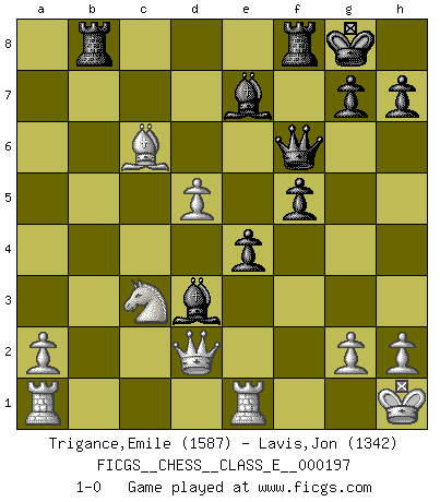 Last move : 1-0 2017 August 14 2:57:2 [Event "FICGS__CHESS__CLASS_E__000197"] [Site "FICGS"] [Date "2017.04.29"] [Round "1"] [White "Trigance,Emile"] [Black "Lavis,Jon"] [Result "1-0"] [WhiteElo "1587"] [BlackElo "1342"] 1.e4 c5 2.Nf3 Nc6 3.d4 cxd4 4.Nxd4 Nf6 5.Nc3 e5 6.Ndb5 d6 7.Nd5 Nxd5 8.exd5 Nb8 9.c4 a6 10.Nc3 Be7 11.Be2 O-O 12.O-O f5 13.f4 Nd7 14.Be3 exf4 15.Bxf4 Qb6+ 16.Kh1 Qxb2 17.Na4 Qf6 18.Bd3 b5 19.cxb5 axb5 20.Bxb5 Rb8 21.Bc6 Ne5 22.Bxe5 dxe5 23.Qc2 e4 24.Nc3 Ba6 25.Rfe1 Bd3 26.Qd2 1-0 Sicilian : Pelikan (Lasker/Sveshnikov) variation Kingside Castling by player Black (move 11) Kingside Castling by player White (move 12) Player White won this chess game. Follow this game move after move (download)Some part of a mistake is always correct. (Savielly Tartakover) Taktik ist was man tun muß, wenn etwas zu tun ist. Strategie ist was man tun muß, wenn nichts zu tun ist. (Savielly Grigorievitsch Tartakower) El Ajedrez es sobre todo, ¡una pelea!. (Emanuel Lasker) Les ravages du H expliquent la différence de niveau entre Tal et Thal [Abergel]. He who fights with monsters should be careful lest he thereby become a monster. (Friedrich Nietzsche, Beyond Good and Evil)