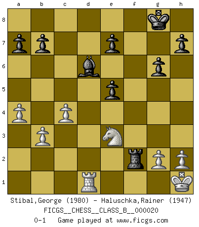 Last move : 0-1 2007 September 8 2:14:19 [Event "FICGS__CHESS__CLASS_B__000020"] [Site "FICGS"] [Date "2007.04.06"] [Round "1"] [White "Stibal,George"] [Black "Haluschka,Rainer"] [Result "0-1"] [WhiteElo "1980"] [BlackElo "1947"] 1.e4 c5 2.Nf3 d6 3.d4 Nf6 4.Nc3 cxd4 5.Nxd4 Nbd7 6.Be2 g6 7.Be3 Bg7 8.Qd2 Ne5 9.f4 Neg4 10.O-O O-O 11.Kh1 Nxe3 12.Qxe3 Qb6 13.e5 dxe5 14.fxe5 Ng4 15.Bxg4 Bxg4 16.Nd5 Qc5 17.c4 Be6 18.Nf5 Qxe3 19.Nfxe3 Rae8 20.Nc7 Rd8 21.Rad1 Rxd1 22.Rxd1 Bxe5 23.Nxe6 fxe6 24.b3 Bf4 25.Nc2 Bd6 26.a4 e5 27.Ne3 Rf2 0-1 Sicilian Kingside Castling by player White (move 10) Kingside Castling by player Black (move 10) Player Black won this chess game. Follow this game move after move (download)You may learn much more from a game you lose than from a game you win. You will have to lose hundreds of games before becoming a good player. (Jose Raul Capablanca) Mit Schach schule ich mein Gefühl für Geometrie, was für Tennis und Schach gleichermaßen wichtig ist. (Boris Becker) Vive, pierde y aprende al observar a tu oponente como ganar. (Amber Steenbock) Vous savez, camarade Pachman, je n'éprouve pas de plaisir à être ministre, je jouerais plutôt aux échecs comme vous, ou alors ferais une révolution au Venezuela. (Che Guevara à Ludek Pachman, 'Checkmate in Prague', 1975) You must do what you feel is right... of course. (Obi-Wan Kenobi in Star Wars ep.4)