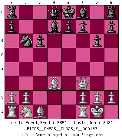 Last move : 1-0 2017 September 1 6:28:5 [Event "FICGS__CHESS__CLASS_E__000197"] [Site "FICGS"] [Date "2017.04.29"] [Round "1"] [White "de la Foret,Fred"] [Black "Lavis,Jon"] [Result "1-0"] [WhiteElo "1585"] [BlackElo "1342"] 1.e4 c5 2.d4 cxd4 3.c3 Nf6 4.e5 Nd5 5.Nf3 Nc6 6.cxd4 d6 7.Bc4 Nb6 8.Bb5 dxe5 9.O-O exd4 10.Nxd4 Bd7 11.Nxc6 bxc6 12.Bd3 g6 13.Qf3 1-0 Sicilian : Smith-Morra gambit Kingside Castling by player White (move 9) Player White won this chess game. Follow this game move after move (download)I'm not afraid of Spassky. The world knows I'm the best. You don't need a match to prove it. (Bobby Fischer) Fischer: 'Remis!?' Uhlmann: 'Aber es muss doch dreimal Zugwiederholung sein!' Fischer: 'Sie nehmen das Remis an, wie ich es sage, sonst spiele ich weiter und werde Sie dann schlagen!' (Robert James Fischer) El Ajedrez es realmente noventa y nueve por ciento calculación. (Soltis) La vie et les Echecs sont tous les deux une lutte constante. (Lasker) The Internet isn't free. It just has an economy that makes no sense to capitalism. (Brad Shapcott)