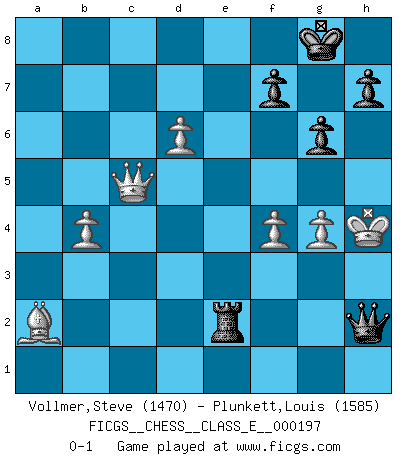 Last move : 0-1 2017 November 18 20:56:32 [Event "FICGS__CHESS__CLASS_E__000197"] [Site "FICGS"] [Date "2017.04.29"] [Round "1"] [White "Vollmer,Steve"] [Black "Plunkett,Louis"] [Result "0-1"] [WhiteElo "1470"] [BlackElo "1585"] 1.Nf3 c5 2.c4 Nc6 3.Nc3 g6 4.g3 e5 5.Bg2 Bg7 6.O-O Nf6 7.d3 O-O 8.h3 d6 9.a3 a6 10.Qc2 Bd7 11.Rb1 Qc8 12.Kh2 Re8 13.b4 cxb4 14.axb4 b5 15.e3 bxc4 16.dxc4 Bf5 17.e4 Bd7 18.Rd1 Bf8 19.Bg5 Nd4 20.Nxd4 exd4 21.Rxd4 Be7 22.Bxf6 Bxf6 23.Rxd6 Be5 24.c5 Bxd6 25.cxd6 Rb8 26.Qd2 Re5 27.Nd5 Qd8 28.f4 Rxd5 29.exd5 a5 30.Qd4 a4 31.Bf1 Bf5 32.Re1 Qxd6 33.Qc5 Qf6 34.Bb5 a3 35.g4 Bxg4 36.hxg4 Qh4+ 37.Kg2 Qxe1 38.Bc4 Re8 39.d6 a2 40.Bxa2 Re2+ 41.Kf3 Qf1+ 42.Kg3 Qg2+ 43.Kh4 Qh2+ 0-1 Reti Opening Kingside Castling by player White (move 6) Kingside Castling by player Black (move 7) Player Black won this chess game. Follow this game move after move (download)You may learn much more from a game you lose than from a game you win. You will have to lose hundreds of games before becoming a good player. (Jose Raul Capablanca) Der Bart als Geschlechtszeichen mitten im Gesicht ist obszön. Daher gefällt er den Weibern. [Zugegeben, kein Schachzitat, aber unglaublich originell] (Arthur Schopenhauer) El Ajedrez es la vida. (Bobby Fischer) Lorsque vous vous retrouvez devant une position atroce, ne tendez pas un ultime piège dérisoire avec l'intention d'abandonner si l'adversaire le déjoue ! Faites-vous plutôt un devoir de résister comme si votre vie en dépendait. Jouez le coup qui vous déplairait au centuple si vous étiez dans la peau de votre tortionnaire ! Remember : Your focus determines your reality. (Qui-Gon Jinn in Star Wars ep.1)
