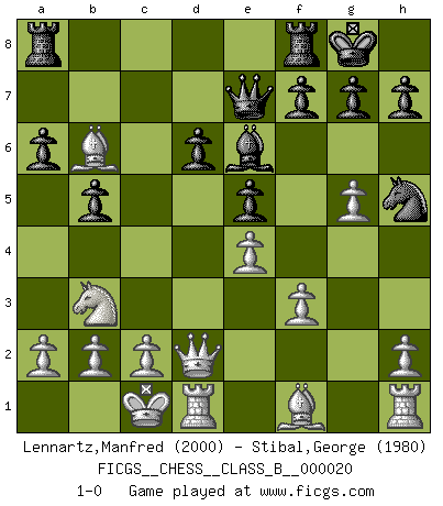 Last move : 1-0 2007 May 6 3:26:25 [Event "FICGS__CHESS__CLASS_B__000020"] [Site "FICGS"] [Date "2007.04.06"] [Round "1"] [White "Lennartz,Manfred"] [Black "Stibal,George"] [Result "1-0"] [WhiteElo "2000"] [BlackElo "1980"] 1.e4 c5 2.Nf3 d6 3.d4 cxd4 4.Nxd4 Nf6 5.Nc3 a6 6.Be3 e5 7.Nb3 Be6 8.f3 Nbd7 9.g4 Be7 10.Qd2 O-O 11.O-O-O b5 12.g5 Nh5 13.Nd5 Nb6 14.Nxe7+ Qxe7 15.Bxb6 1-0 Sicilian : Najdorf, Byrne (English) attack Kingside Castling by player Black (move 10) Queenside Castling by player White (move 11) Player White won this chess game. Follow this game move after move (download)Winning isn't everything... but losing is nothing. (Mednis) Im Fernschach kannst du während dem Spiel rauchen. (John Christen Knudsen) El arma más poderosa en el Ajedrez, es tener la próxima movida. (David Bronstein) Mais l'homme est une créature légère et illogique : semblable au joueur d'échecs, il n'aime que le processus du but à atteindre, non le but lui-même. (Dostoïevsky) If you don't practice you don't deserve to win. (Andre Agassi)