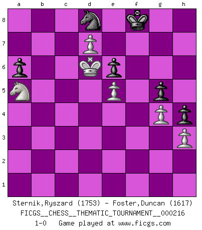 Last move : 1-0 2017 November 2 20:9:17 [Event "FICGS__CHESS__THEMATIC_TOURNAMENT__000216"] [Site "FICGS"] [Date "2017.04.29"] [Round "1"] [White "Sternik,Ryszard"] [Black "Foster,Duncan"] [Result "1-0"] [WhiteElo "1753"] [BlackElo "1617"] 1.d4 Nf6 2.c4 g6 3.Nc3 d5 4.cxd5 Nxd5 5.e4 Nxc3 6.bxc3 Bg7 7.Nf3 c5 8.Be3 Qa5 9.Qd2 O-O 10.Rc1 cxd4 11.cxd4 Qxd2+ 12.Nxd2 e6 13.Bb5 Bd7 14.Bxd7 Nxd7 15.Ke2 Rac8 16.Rb1 b6 17.Rhc1 Nf6 18.a4 Rfd8 19.Rxc8 Rxc8 20.a5 bxa5 21.Ra1 a6 22.Rxa5 Ra8 23.f3 Bf8 24.Nc4 Nd7 25.Kd3 f5 26.Bf4 Be7 27.Ra2 Kf7 28.Rb2 g5 29.Bc7 Ra7 30.Ba5 h5 31.g3 Kg6 32.Rb1 fxe4+ 33.fxe4 Kf6 34.e5+ Kf5 35.h3 Kg6 36.Ke4 h4 37.g4 Kf7 38.d5 Nc5+ 39.Kd4 Rb7 40.Rxb7 Nxb7 41.d6 Bf8 42.Bb4 Nd8 43.Na5 Ke8 44.d7+ Kf7 45.Bd6 Be7 46.Kc5 Bf8 47.Bxf8 Kxf8 48.Kd6 1-0 King's Indian defense, 3.Nc3 Kingside Castling by player Black (move 9) Player White won this chess game. Follow this game move after move (download)When in doubt... play Chess ! (Tevis) Ich habe Putins Aufstieg an die Macht beobachtet und seine Politik, die demokratischen Institutionen meines Landes zu zerstören. (Garry Kasparov) Para mi, el Ajedrez es la vida y cada partida es como una nueva vida. Todo jugador de Ajedrez suele vivir muchas vidas durante su vida. (Eduard Gufeld) La vie est comme un jeu d'échecs : nous esquissons un plan, mais celui-ci est tributaire de ce que daignent faire l'adversaire aux échecs et le destin dans la vie. (Arthur Schopenhauer) He who is a good ruler must first have been ruled. (Aristotle)