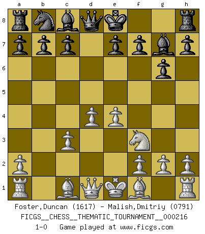 Last move : 1-0 2017 June 15 21:6:23 [Event "FICGS__CHESS__THEMATIC_TOURNAMENT__000216"] [Site "FICGS"] [Date "2017.04.29"] [Round "1"] [White "Foster,Duncan"] [Black "Malish,Dmitriy"] [Result "1-0"] [WhiteElo "1617"] [BlackElo "0791"] 1.d4 Nf6 2.c4 g6 3.Nc3 d5 4.cxd5 Nxd5 5.e4 Nxc3 6.bxc3 Bg7 7.Nf3 1-0 This chess game has been lost on time (started : 2017.04.29 20:11:32) King's Indian defense, 3.Nc3 Player White won this chess game. Follow this game move after move (download)All I want to do, ever, is just play Chess. (Bobby Fischer) Weshalb minderdergeübte Spieler mit g2-g4 beginnen? Die betreffenden sind unschlüssig, ob sie nun rechts (h4) oder links (f4) beginnen sollen, und in ihrer Ratlosigkeit entschliessen sie sich nach guter Bürgerart dazu, den goldenen Mittelweg zu wählen. (Aaron Nimzowitsch) En el Ajedrez, cuando menos, el valiente hereda la tierra. (Edmar Mednis) Aidez vos pièces, elles vous aideront. (Paul Morphy) Even the best needles are not sharp at both ends. (Chinese proverb)
