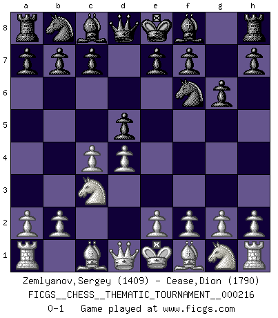 Last move : 0-1 2017 June 8 20:15:38 [Event "FICGS__CHESS__THEMATIC_TOURNAMENT__000216"] [Site "FICGS"] [Date "2017.04.29"] [Round "1"] [White "Zemlyanov,Sergey"] [Black "Cease,Dion"] [Result "0-1"] [WhiteElo "1409"] [BlackElo "1790"] 1.d4 Nf6 2.c4 g6 3.Nc3 d5 0-1 This chess game has been lost on time (started : 2017.04.29 20:11:32) King's Indian defense, 3.Nc3 Player Black won this chess game. Follow this game move after move (download)A man that will take back a move at Chess will pick a pocket. (Richard Fenton) Ich liebe den Moment, wenn ich das Ego meines Gegenüber breche. (Robert James Fischer) En el tablero, la mentira e hipocresía no sobreviven mucho. (Emanuel Lasker) Que feriez-vous si vous étiez en train de jouer aux échecs et que la fin du monde arrive ? Je continuerais à jouer. (Saint Borromée) Indecision is the key to flexibility. (Unknown)