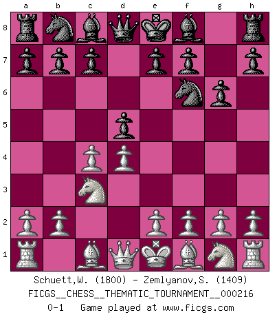 Last move : 0-1 2017 June 8 20:15:38 [Event "FICGS__CHESS__THEMATIC_TOURNAMENT__000216"] [Site "FICGS"] [Date "2017.04.29"] [Round "1"] [White "Schuett,Wilhelm"] [Black "Zemlyanov,Sergey"] [Result "0-1"] [WhiteElo "1800"] [BlackElo "1409"] 1.d4 Nf6 2.c4 g6 3.Nc3 d5 0-1 This chess game has been lost on time (started : 2017.04.29 20:11:32) King's Indian defense, 3.Nc3 Player Black won this chess game. Follow this game move after move (download)You must take your opponent into a deep dark forest where 2+2=5, and the path leading out is only wide enough for one. (Mikhail Tal) Schach ist das schnellste Spiel der Welt, weil man in jeder Sekunde Tausende von Gedanken ordnen muß. (Albert Einstein) Muchos se han convertido en Maestros de Ajedrez, nadie se ha convertido en el Maestro del Ajedrez. (Siegbert Tarrasch) Il n'y a pas de prix trop élevé au scalp de l'ennemi. (Koblentz) Ah, the Socrating method. The best way we have of teaching everything-apart from juggling chainsaws. (Gregory House, House M.D.)