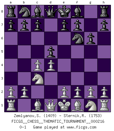 Last move : 0-1 2017 June 8 20:15:38 [Event "FICGS__CHESS__THEMATIC_TOURNAMENT__000216"] [Site "FICGS"] [Date "2017.04.29"] [Round "1"] [White "Zemlyanov,Sergey"] [Black "Sternik,Ryszard"] [Result "0-1"] [WhiteElo "1409"] [BlackElo "1753"] 1.d4 Nf6 2.c4 g6 3.Nc3 d5 0-1 This chess game has been lost on time (started : 2017.04.29 20:11:32) King's Indian defense, 3.Nc3 Player Black won this chess game. Follow this game move after move (download)Kasparov : J'adoube , Ivanchuk : S'il vous plaît ! (Garry Kasparov & Vassily Ivanchuk, Linares 1997) Ich brauche nur einen Blick auf das Schachbrett zu werfen, und weiß schon, was in der Stellung steckt, was geschehen kann und was geschehen wird. Alle übrigen suchen und prüfen, ich aber weiß es! (José Raúl Capablanca) Robert Fischer es la ley hacia si mismo. (Larry Evans) Dans le domaine de la peinture, de la gravure et de la sculpture, dès la première décennie de notre siècle, les artistes abandonnent la représentation de la partie d'échecs pour se concentrer sur les pièces, sur les échiquiers et sur toutes les variations auxquelles les unes et les autres peuvent donner lieu. On passe en quelque sorte d'un thème social à un thème musical (au sens de la musica médiévale, c'est-à -dire d'une notion qui inclue le rythme, l'harmonie, la construction et la déconstruction, etc.). Graphiquement et picturalement, l'échiquier apparaît comme une structure ouverte, dynamique, d'une richesse infinie, autorisant toutes les combinatoires et débouchant sur des mouvements et des rythmes de nature exponentielle. (Michel Pastoureau) A cynic is a man who knows the price of everything but the value of nothing. (Oscar Wilde)