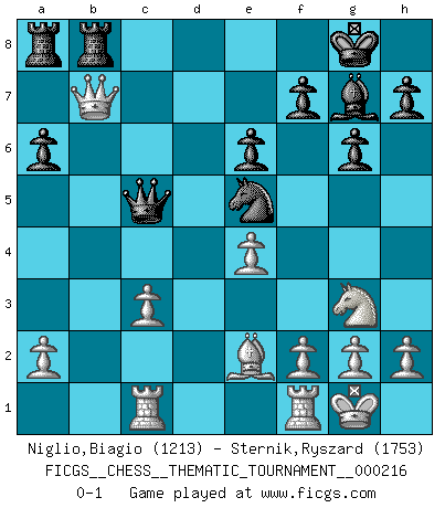 Last move : 0-1 2017 June 1 12:2:7 [Event "FICGS__CHESS__THEMATIC_TOURNAMENT__000216"] [Site "FICGS"] [Date "2017.04.29"] [Round "1"] [White "Niglio,Biagio"] [Black "Sternik,Ryszard"] [Result "0-1"] [WhiteElo "1213"] [BlackElo "1753"] 1.d4 Nf6 2.c4 g6 3.Nc3 d5 4.cxd5 Nxd5 5.e4 Nxc3 6.bxc3 Bg7 7.Bc4 c5 8.Ne2 Nc6 9.Be3 O-O 10.O-O Qc7 11.Rc1 Rd8 12.Qd2 Qa5 13.Qb2 b6 14.Qb3 e6 15.Bb5 Bb7 16.dxc5 bxc5 17.Bxc5 Ne5 18.Ng3 a6 19.Be2 Qxc5 20.Qxb7 Rdb8 0-1 King's Indian defense, 3.Nc3 Kingside Castling by player Black (move 9) Kingside Castling by player White (move 10) Player Black won this chess game. Follow this game move after move (download)The laws of Chess do not permit a free choice: you have to move whether you like it or not. (Emanuel Lasker) Jede Eröffnung ist gut genug um gespielt zu werden, wenn nur ihr Ruf schlecht genug ist. (Savielly Grigorievitsch Tartakower) No puedes jugar al Ajedrez si eres de corazón noble. (Proverbio Francés) Je ne suis pas le dernier à jouer lâchement des coups douteux pendant le zeïtnot de l'adversaire pour l'achever: en effet les coups qui font le plus peur sont ceux que l'on ne comprend pas. Je me fais souvent peur quand je joue. (Un professeur anonyme) Life is painting a picture, not doing a sum. (Oliver Wendell Holmes, Jr.)