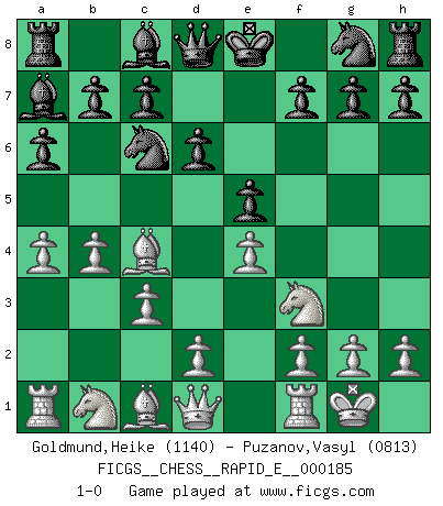 Last move : 1-0 2017 June 8 8:13:49 [Event "FICGS__CHESS__RAPID_E__000185"] [Site "FICGS"] [Date "2017.04.30"] [Round "1"] [White "Goldmund,Heike"] [Black "Puzanov,Vasyl"] [Result "1-0"] [WhiteElo "1140"] [BlackElo "0813"] 1.e4 e5 2.Nf3 Nc6 3.Bc4 Bc5 4.c3 d6 5.a4 a6 6.b4 Ba7 7.O-O 1-0 This chess game has been lost on time (started : 2017.04.30 0:49:48) Giuoco Piano Kingside Castling by player White (move 7) Player White won this chess game. Follow this game move after move (download)Chess makes man wiser and clear-sighted. (Vladimir Putin) Smyslow ist ein Beweis dafür, dass ich noch zehn Jahre spielen kann! [der 75 jährige über den 85 jährigen] (Viktor Kortschnoi) Fischer sacrificó virtualmente todo lo que la mayoría de nosotros los 'debiles' (término que él usa) valoramos, respetamos y apreciamos por el amor de un astuto, a menudo hermoso tablero de juego, por el privilegio ambivalente de ser su mas grande maestro. (Paul Kollar) Fischer est le meilleur joueur du monde et Karpov n'est qu'un joueur de bistrot. (Garry Kasparov, agé de 16 ans) In my experience, there's no such thing as luck. (Obi-Wan Kenobi in Star Wars ep.4)