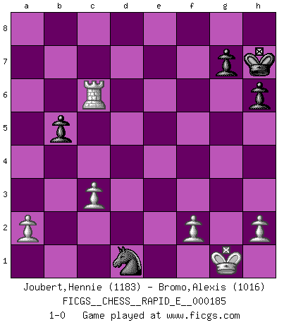 Last move : 1-0 2017 July 19 7:57:0 [Event "FICGS__CHESS__RAPID_E__000185"] [Site "FICGS"] [Date "2017.04.30"] [Round "1"] [White "Joubert,Hennie"] [Black "Bromo,Alexis"] [Result "1-0"] [WhiteElo "1183"] [BlackElo "1016"] 1.e4 e5 2.Nf3 Nc6 3.Bc4 h6 4.d4 Nf6 5.O-O Nxe4 6.Re1 d5 7.Bb5 Bd6 8.dxe5 Bc5 9.Be3 Bxe3 10.Rxe3 a6 11.Ba4 b5 12.Bb3 Be6 13.Nbd2 O-O 14.c3 f5 15.exf6 Rxf6 16.Nxe4 dxe4 17.Rxe4 Bxb3 18.Qxb3+ Kh7 19.Qc2 Kh8 20.Rd1 Qf8 21.Rd7 Rxf3 22.gxf3 Qxf3 23.Qe2 Qxe2 24.Rxe2 Rc8 25.Re6 Nb8 26.Rf7 c5 27.R6e7 Nc6 28.Rc7 Rxc7 29.Rxc7 Ne5 30.Rc8+ Kh7 31.Rxc5 Nd3 32.Rc6 Nxb2 33.Rxa6 Nd1 34.Rc6 1-0 King's pawn game Kingside Castling by player White (move 5) Kingside Castling by player Black (move 13) Player White won this chess game. Follow this game move after move (download)In the perfect Chess combination as in a first-rate short story, the whole plot and counter-plot should lead up to a striking finale, the interest not being allayed until the very last moment. (Yates and Winter) Frage: Wie viele Autos haben Sie schon zerstört? - Antwort: Nur zwei. (Loek van Wely) Repentinamente, me resultaba obvio en mi analisis que yo había pasado por alto lo que Fischer había visto en el tablero con la mas grande facilidad. (Mikhail Botvinnik) Un journaliste : 'Vous préférez avoir une dame de plus sur l'échiquier ou au lit ?' Boris Spassky : 'Ca dépend de la position.' All the troubles of the world come from being unable to sit alone in a quiet room. (Blaise Pascal)