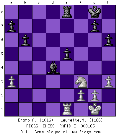 Last move : 0-1 2017 July 9 11:14:48 [Event "FICGS__CHESS__RAPID_E__000185"] [Site "FICGS"] [Date "2017.04.30"] [Round "1"] [White "Bromo,Alexis"] [Black "Leurette,Marc-Antoine"] [Result "0-1"] [WhiteElo "1016"] [BlackElo "1166"] 1.d4 d5 2.c4 e6 3.a3 Nf6 4.Nc3 b6 5.Nf3 Bb7 6.Bg5 Be7 7.Bxf6 Bxf6 8.e3 c5 9.b3 O-O 10.Be2 Re8 11.O-O cxd4 12.exd4 Nd7 13.Re1 h6 14.h3 dxc4 15.Bxc4 e5 16.dxe5 Bxf3 17.Qxf3 Nxe5 18.Qg3 Nxc4 19.bxc4 Qc8 20.Rac1 Rxe1+ 21.Rxe1 Qxc4 22.Ne4 Bd4 23.Qg4 Qe6 24.Qxe6 fxe6 25.Nd2 e5 26.Nf3 Re8 0-1 This chess game has been lost on time (started : 2017.04.30 0:49:48) Queen's gambit declined Kingside Castling by player Black (move 9) Kingside Castling by player White (move 11) Player Black won this chess game. Follow this game move after move (download)I give 98 percent of my mental energy to Chess. Others give only 2 percent. (Bobby Fischer) Was ist der Unterschied zwischen einem Strassenarbeiter und einem Schachspieler? --Der Schachspieler bewegt sich ab und zu. (Anonymous) La belleza de un movimiento no se refleja solo en su apariencia, sino en el pensamiento detrás de él. (Siegbert Tarrasch) Je ne suis pas le dernier à jouer lâchement des coups douteux pendant le zeïtnot de l'adversaire pour l'achever: en effet les coups qui font le plus peur sont ceux que l'on ne comprend pas. Je me fais souvent peur quand je joue. (Un professeur anonyme) Life is like a play: it's not the length but the excellence of the acting that matters. (Seneca)