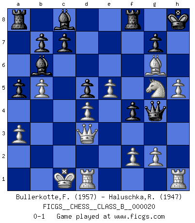 Last move : 0-1 2007 November 29 19:56:39 [Event "FICGS__CHESS__CLASS_B__000020"] [Site "FICGS"] [Date "2007.04.06"] [Round "1"] [White "Bullerkotte,Frank"] [Black "Haluschka,Rainer"] [Result "0-1"] [WhiteElo "1957"] [BlackElo "1947"] 1.d4 Nf6 2.c4 e6 3.Nc3 Bb4 4.Qc2 d5 5.cxd5 Nxd5 6.e4 Nf6 7.Nf3 O-O 8.a3 Ba5 9.Bd3 Nc6 10.e5 Nh5 11.Bxh7+ Kh8 12.Be3 f5 13.Bg6 Nf6 14.b4 Bb6 15.O-O-O Nd5 16.Bg5 Qd7 17.Nxd5 exd5 18.Qe2 f4 19.h4 a5 20.b5 Nd8 21.h5 Ne6 22.Qd3 Nxg5 23.Nxg5 Qg4 0-1 This chess game has been lost on time (started : 2007.04.06 13:14:37) Nimzo-Indian : Classical, Noa variation Kingside Castling by player Black (move 7) Queenside Castling by player White (move 15) Player Black won this chess game. Follow this game move after move (download)The passed Pawn is a criminal, who should be kept under lock and key. Mild measures, such as police surveillance, are not sufficient. (Aaron Nimzovich) Pläne sind die Träume des Verständigen. (Ernst Freiherr von Feuchtersleben) Yo creo que el Ajedrez posee una magia que es también una ayuda en la edad avanzada. Una rodilla reumática es olvidada durante una partida de Ajedrez y otros eventos pueden parecer algo sin importancia comparada a una catástrofe en el tablero de Ajedrez. (Vlastimil Hort) Le joueur d'Echecs qui veut atteindre le top est obligé de développer son propre credo créatif. Alexeï Stepanovicth Souétine. Il est facile d'écrire des livres ! Ce qui est difficile, c'est de jouer ! (Alexeï Stepanovicth Souétine) Just because you do not take an interest in politics doesn't mean politics won't take an interest in you. (Pericles 430 B.C.)