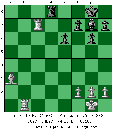 Last move : 1-0 2017 June 1 23:39:35 [Event "FICGS__CHESS__RAPID_E__000185"] [Site "FICGS"] [Date "2017.04.30"] [Round "1"] [White "Leurette,Marc-Antoine"] [Black "Piantadosi,Angelo"] [Result "1-0"] [WhiteElo "1166"] [BlackElo "1360"] 1.e4 c5 2.d4 cxd4 3.c3 dxc3 4.Nxc3 d6 5.Nf3 Nf6 6.Bc4 e6 7.e5 dxe5 8.Nxe5 Qxd1+ 9.Nxd1 Nfd7 10.Nxd7 Bxd7 11.O-O Nc6 12.Nc3 Be7 13.Be3 O-O 14.Rad1 Rfd8 15.a3 Rac8 16.Ba2 Bf6 17.Rc1 Ne5 18.Bxa7 Nd3 19.Rc2 Nxb2 20.Rxb2 Rxc3 21.Rxb7 Rxa3 22.Bb1 g6 23.Be3 Bc6 24.Rc7 Bd5 25.Bh6 Bg7 26.Bc1 Ba2 27.Bxa3 Bxb1 28.Rxb1 1-0 Sicilian : Smith-Morra gambit Kingside Castling by player White (move 11) Kingside Castling by player Black (move 13) Player White won this chess game. Follow this game move after move (download)It's always better to sacrifice your opponent's men. (Savielly Tartakover) Das Schach hält seine Meister in eigenen Banden, Fesseln; auf vielerlei Weise formt es ihren Geist, so dass die innere Freiheit selbst des Stärksten beeinflusst wird. (Albert Einstein) El Ajedrez, como cualquier otra actividad creativa, puede existir solo a través de méritos combinados de aquellos que tienen talento creativo y de aquellos que tienen la habilidad de organizar un trabajo creativo. (Mikhail Botvinnik) Horreur, mais aussi harmonie suprême : qu'y avait-il en effet au monde en dehors des échecs ? Le brouillard, l'inconnu, le non-être... (Vladimir Nabokov) Perception is reality. (Immanuel Kant)
