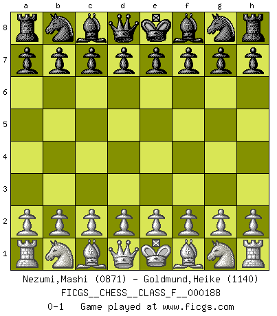 Last move : 0-1 2017 June 10 20:33:26 [Event "FICGS__CHESS__CLASS_F__000188"] [Site "FICGS"] [Date "2017.05.01"] [Round "1"] [White "Nezumi,Mashi"] [Black "Goldmund,Heike"] [Result "0-1"] [WhiteElo "0871"] [BlackElo "1140"] 0-1 This chess game has been lost on time (started : 2017.05.01 10:58:34) Player Black won this chess game. Follow this game move after move (download)Chess is the art which expresses the science of logic. (Mikhail Botvinnik) Über Frauen: Chess is better. (Robert James Fischer) Un entendimiento minucioso de las típicas continuaciones de mate hacen de las mas complicadas combinaciones de sacrificio que conducen hacia ellas no solo no dificiles, sino casi un asunto de rutina. (Siegbert Tarrasch) Une platitude souvent récitée à propos des Echecs est qu'une des choses les plus difficiles à réaliser est de gagner une position gagnante. Cela ne manque pas de sens mais, pour ma part, j'ai toujours trouvé plus difficile de gagner une position perdante. (Tim Krabbe) There's always a bigger fish. (Qui-Gon Jinn in Star Wars ep.1)