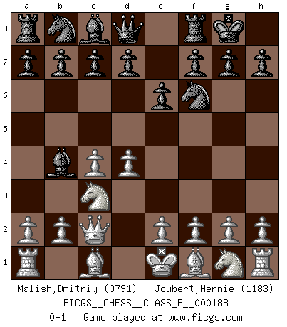Last move : 0-1 2017 June 11 8:46:12 [Event "FICGS__CHESS__CLASS_F__000188"] [Site "FICGS"] [Date "2017.05.01"] [Round "1"] [White "Malish,Dmitriy"] [Black "Joubert,Hennie"] [Result "0-1"] [WhiteElo "0791"] [BlackElo "1183"] 1.d4 Nf6 2.c4 e6 3.Nc3 Bb4 4.Qc2 O-O 0-1 This chess game has been lost on time (started : 2017.05.01 10:58:34) Nimzo-Indian : Classical variation Kingside Castling by player Black (move 4) Player Black won this chess game. Follow this game move after move (download)There's never before been a Chess player with such a thorough knowledge of the intricacies of the game and such an absolutely indomitable will to win. I think Bobby is the greatest player that ever lived. (Lisa Lane) Besser ein falscher Plan, logisch durchgeführt, als gar kein Plan. (Viktor Kortschnoi) Dios mío, Bobby Fischer juega tan simple. (Alexei Suetin) Je ne crois pas en la psychologie, je crois aux bons coups. (Robert Fischer) First of all, we have to go back to the classical time control. (Anatoly Karpov)
