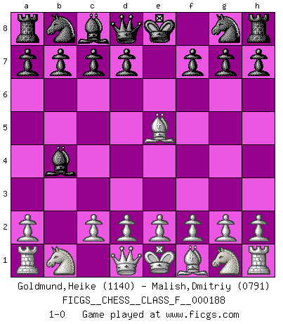 Last move : 1-0 2017 June 14 9:5:31 [Event "FICGS__CHESS__CLASS_F__000188"] [Site "FICGS"] [Date "2017.05.01"] [Round "1"] [White "Goldmund,Heike"] [Black "Malish,Dmitriy"] [Result "1-0"] [WhiteElo "1140"] [BlackElo "0791"] 1.b4 e5 2.Bb2 Bxb4 3.Bxe5 1-0 This chess game has been lost on time (started : 2017.05.01 10:58:34) Polish (Sokolsky) opening Player White won this chess game. Follow this game move after move (download)A great player and a great example for many. His book My 60 Memorable Games had a big impact on me. It is a shame he didn't continue to enrich the world of chess with his unparalleled understanding after 1972. (Jan Timman, about Bobby Fischer's death) Ein typischer, sehr verbreiteter Gedankenschädling ist der, daß der betreffende Amateur von der Annanhme ausgeht, daß jeder einzelne Zug etwas zu leisten habe. (Aaron Nimzowitsch) El Ajedrez no es una pizca de inferior al violín, y tenemos un gran número de violinistas profesionales. (Mikhail Botvinnik) Nous sommes les pions de la mystérieuse partie d'Echecs jouée par Dieu. Il nous déplace, nous arrête, nous pousse encore, puis nous lance un à un dans la boîte du Néant. Epitaphe sur la tombe de David Janowsky (1868-1927). If only faces could talk... (Pat Summerall, Sportscaster during the Super Bowl)