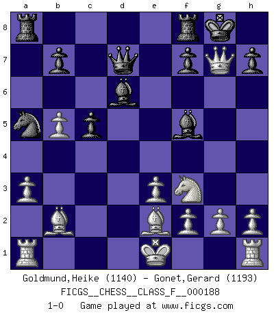 Last move : 1-0 2017 May 18 11:48:45 [Event "FICGS__CHESS__CLASS_F__000188"] [Site "FICGS"] [Date "2017.05.01"] [Round "1"] [White "Goldmund,Heike"] [Black "Gonet,Gerard"] [Result "1-0"] [WhiteElo "1140"] [BlackElo "1193"] 1.b4 Nf6 2.Bb2 a6 3.e3 Nc6 4.a3 e5 5.b5 Na5 6.c4 d5 7.d3 dxc4 8.dxc4 Be6 9.Nd2 axb5 10.cxb5 Bd6 11.Qc2 O-O 12.Be2 Qd7 13.Ngf3 e4 14.Nxe4 Nxe4 15.Qxe4 Bf5 16.Qd4 c5 17.Qxg7+ 1-0 Polish (Sokolsky) opening Kingside Castling by player Black (move 11) Player White won this chess game. Follow this game move after move (download)When the Chess game is over, the Pawn and the King go back to the same box. (Irish saying) Frage: Wie viele Autos haben Sie schon zerstört? - Antwort: Nur zwei. (Loek van Wely) Un entendimiento minucioso de las típicas continuaciones de mate hacen de las mas complicadas combinaciones de sacrificio que conducen hacia ellas no solo no dificiles, sino casi un asunto de rutina. (Siegbert Tarrasch) Plusieurs personnes se sont demandées comment Tal faisait pour gagner... En fait, c'est très simple ! Il met ses pièces au centre de l'échiquier et les sacrifie quelque part ! (David Bronstein) The difference between stupidity and genius is that genius has its limits. (Murphy)