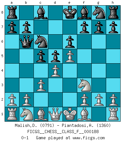 Last move : 0-1 2017 June 12 21:0:37 [Event "FICGS__CHESS__CLASS_F__000188"] [Site "FICGS"] [Date "2017.05.01"] [Round "1"] [White "Malish,Dmitriy"] [Black "Piantadosi,Angelo"] [Result "0-1"] [WhiteElo "0791"] [BlackElo "1360"] 1.e4 e6 2.d4 d5 3.e5 c5 4.c3 Nc6 5.Nf3 Qb6 0-1 This chess game has been lost on time (started : 2017.05.01 10:58:34) French : Advance, Paulsen attack Player Black won this chess game. Follow this game move after move (download)Your body has to be in top condition. Your Chess deteriorates as your body does. You can't separate body from mind. (Bobby Fischer) Im Schach gewinnt jeder. Hat man Freunde am Spiel - und das ist die Hauptsache - ist auch der Verlust einer Partie kein Unglück. (David Bronstein) Ciertamente el estado mental actual de Bobby Fischer es una tragedia. Uno de los mas grandes jugadores de Ajedrez del mundo -el orgullo y pena del Ajedrez Americano. (Frank Brady) Aux échecs, l'amour-propre est satisfait quand on remporte la victoire, mais il n'y a pas de honte à être battu. (Benjamin Franklin) There are two types of people in this world, good and bad. The good sleep better, but the bad seem to enjoy the waking hours much more. (Woody Allen)