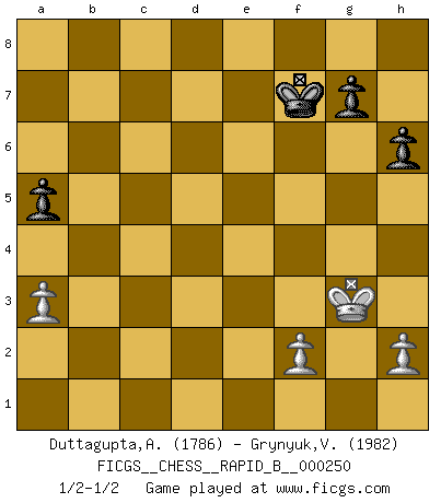 Last move : 1/2-1/2 2017 July 22 19:7:20 [Event "FICGS__CHESS__RAPID_B__000250"] [Site "FICGS"] [Date "2017.05.07"] [Round "1"] [White "Duttagupta,Aniruddha"] [Black "Grynyuk,Vasyl"] [Result "1/2-1/2"] [WhiteElo "1786"] [BlackElo "1982"] 1.e4 e5 2.Nf3 Nc6 3.Bb5 a6 4.Ba4 Nf6 5.O-O Be7 6.Qe2 b5 7.Bb3 O-O 8.c3 d5 9.d3 Bb7 10.Rd1 Re8 11.Nbd2 Bf8 12.Nf1 h6 13.Ne3 Na5 14.Nxd5 Nxd5 15.Bxd5 Bxd5 16.exd5 Qxd5 17.b4 Nb7 18.Be3 c5 19.c4 Qe6 20.bxc5 Bxc5 21.Rab1 Bxe3 22.Qxe3 Nd6 23.c5 Nf5 24.Qe4 Rac8 25.Rbc1 Red8 26.Re1 Rd5 27.g4 Ne7 28.d4 Ng6 29.Kf1 Qd7 30.Nxe5 Nxe5 31.dxe5 R8xc5 32.Rxc5 Rxc5 33.e6 fxe6 34.Qxe6+ Qxe6 35.Rxe6 a5 36.a3 Rc4 37.Rb6 Rxg4 38.Rxb5 Ra4 39.Rb3 Kf7 40.Kg2 Rg4+ 41.Rg3 Rxg3+ 42.Kxg3 1/2-1/2 Ruy Lopez : Worrall attack, sharp line Kingside Castling by player White (move 5) Kingside Castling by player Black (move 7) 10 pieces endgame at move 38 : White KRPPP , Black KRPPP WHITE : King + 1 Rook 3 Pawns BLACK : King + 1 Rook 3 Pawns 9 pieces endgame at move 41 : White KPPP , Black KRPPP WHITE : King + 3 Pawns BLACK : King + 1 Rook 3 Pawns 8 pieces endgame at move 42 : White KPPP , Black KPPP WHITE : King + 3 Pawns BLACK : King + 3 Pawns This chess game ended in a draw. Follow this game move after move (download)Strategy requires thought, tactics require observation. (Max Euwe) Im Spitzenschach von heute geht es nur um Vorbereitung, um tiefgründige, sorgfältige Eröffnungsvorbereitung. (Nigel Short) El Ajedrez es parte de una cultura y si una cultura esta en decadencia, entonces también el Ajedrez declinará. (Mikhail Botvinnik) Dieu déplace le joueur, et celui-ci la pièce. Quel Dieu derrière Dieu commence donc la trame ? Arturo Perez-Reverte (prix de littérature policière 1993). Ah, beer! The cause of, and the solution to, all of life's problems. (Homer Simpson)
