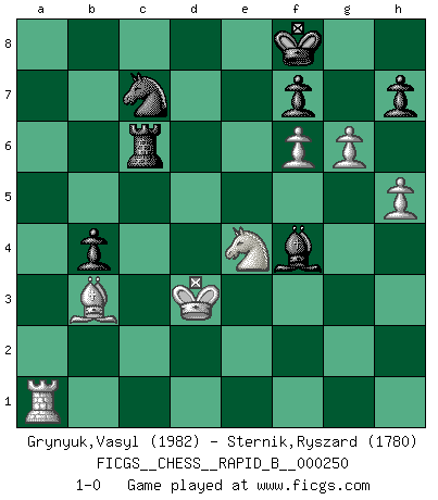 Last move : 1-0 2017 June 9 14:44:27 [Event "FICGS__CHESS__RAPID_B__000250"] [Site "FICGS"] [Date "2017.05.07"] [Round "1"] [White "Grynyuk,Vasyl"] [Black "Sternik,Ryszard"] [Result "1-0"] [WhiteElo "1982"] [BlackElo "1780"] 1.e4 c5 2.Nf3 d6 3.d4 cxd4 4.Nxd4 Nf6 5.Nc3 a6 6.Be3 e5 7.Nb3 Be6 8.f3 Be7 9.Qd2 O-O 10.O-O-O Nbd7 11.g4 b5 12.g5 b4 13.Ne2 Ne8 14.f4 a5 15.f5 Bxb3 16.cxb3 a4 17.bxa4 Rxa4 18.Kb1 Rxa2 19.Nc1 Ra8 20.Nb3 Qb8 21.Bc4 Nb6 22.Bxb6 Qxb6 23.f6 Bd8 24.fxg7 Nxg7 25.Rhg1 d5 26.Qxd5 Bc7 27.Qd3 Rad8 28.Qf3 Ne6 29.Qf5 Nf4 30.Rc1 Kg7 31.Rgf1 Qg6 32.Bb5 Bb8 33.Nc5 Rd4 34.h4 Rfd8 35.Bc4 Rf8 36.Bb3 Bd6 37.Nd7 Qxf5 38.exf5 Rd8 39.Nf6 Nd3 40.Rcd1 e4 41.Nxe4 Be5 42.f6+ Kf8 43.Rf3 Nxb2 44.Rxd4 Rxd4 45.Nc5 Nd1 46.Rf5 Nc3+ 47.Kc2 Bg3 48.h5 Rd6 49.Rf1 Nd5 50.Ra1 Nc7 51.Ne4 Rc6+ 52.Kd3 Bf4 53.g6 1-0 Sicilian : Najdorf, Byrne (English) attack Kingside Castling by player Black (move 9) Queenside Castling by player White (move 10) Player White won this chess game. Follow this game move after move (download)For surely of all the drugs in the world, Chess must be the most permanently pleasurable. (Assiac) Zu meiner Zeit war ein 20 jähriger ein junger Spieler, heute ist er ein Veteran. (Garry Kasparov) Si pudieramos observar el interior de la cabeza de un jugador de Ajedrez, encontraríamos ahí un mundo lleno de sentimientos, imágenes, ideas, emoción y pasión. (Alfred Binet) Celui qui prend des risques peut perdre, celui qui n'en prend pas perd toujours. (Xavier Tartacover) Quotation,n.: The act of repeating erroneously the words of another. The words erroneously repeated. (Ambrose Bierce, The Devil's Dictionary)
