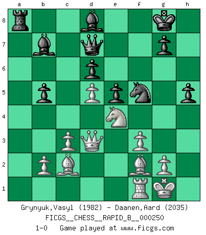 Last move : 1-0 2017 May 16 22:21:20 [Event "FICGS__CHESS__RAPID_B__000250"] [Site "FICGS"] [Date "2017.05.07"] [Round "1"] [White "Grynyuk,Vasyl"] [Black "Daanen,Aard"] [Result "1-0"] [WhiteElo "1982"] [BlackElo "2035"] 1.e4 e5 2.Nf3 Nc6 3.Bb5 a6 4.Ba4 Nf6 5.O-O Be7 6.Re1 b5 7.Bb3 d6 8.c3 O-O 9.h3 Re8 10.d4 Bb7 11.Nbd2 Bf8 12.a4 Qd7 13.axb5 axb5 14.Rxa8 Bxa8 15.d5 Ne7 16.Nf1 h6 17.N3h2 c6 18.Ng4 Nxg4 19.hxg4 cxd5 20.exd5 Bb7 21.f3 Ra8 22.Be3 Ng6 23.Ng3 Be7 24.Rf1 Bd8 25.Ne4 Nh4 26.Qd3 f5 27.gxf5 Nxf5 28.Bf2 h5 29.Bc2 1-0 Ruy Lopez : Closed Kingside Castling by player White (move 5) Kingside Castling by player Black (move 8) Player White won this chess game. Follow this game move after move (download)Chess is mental torture. (Garry Kasparov) Rubinstein ist ein Turmendspiel, welches die Götter vor tausenden von Jahren begannen. (Savielly Grigorievitsch Tartakower) No soy una persona materialista y por eso, no resiento la falta o pérdida del dinero. La ausencia de cosas mundanas carece de importancia. Ya que el Ajedrez es una forma en la que puedo ser tan materialista como yo desee sin tener la necesidad de vender mi alma. (Jamie Walter Adams) Le temps de noter son nom sur la feuille de partie, j'étais déjà en zeitnot ! D'un modeste amateur apparié lors de la première ronde d'un open contre le grand-maître Azmaïparashvili. Computers have lots of memory but no imagination. (Anonymous)