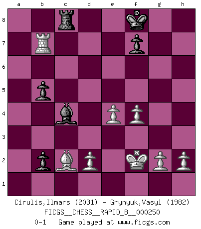 Last move : 0-1 2017 June 12 0:17:34 [Event "FICGS__CHESS__RAPID_B__000250"] [Site "FICGS"] [Date "2017.05.07"] [Round "1"] [White "Cirulis,Ilmars"] [Black "Grynyuk,Vasyl"] [Result "0-1"] [WhiteElo "2031"] [BlackElo "1982"] 1.b4 e5 2.a3 d5 3.Bb2 Bd6 4.Nf3 Qe7 5.c4 dxc4 6.e3 Nf6 7.Bxc4 O-O 8.Nc3 c6 9.Qc2 Nbd7 10.Ng5 Nb6 11.Bd3 h6 12.Nge4 Nxe4 13.Nxe4 Rd8 14.O-O Bc7 15.Rac1 Nd5 16.Rfe1 Bb6 17.Ng3 a6 18.Nf5 Qe8 19.Rb1 a5 20.Bc4 Bc7 21.Rec1 axb4 22.axb4 Nxb4 23.Nxh6+ gxh6 24.Qg6+ Kf8 25.Qxh6+ Kg8 26.e4 Rd6 27.Qg5+ Kf8 28.Qxe5 Qxe5 29.Bxe5 c5 30.Bb5 Rc6 31.Bxc7 Rxc7 32.Rxb4 cxb4 33.Rxc7 b3 34.f4 b2 35.Bd3 b5 36.Kf2 Be6 37.Rb7 Bc4 38.Bc2 Rc8 0-1 Polish (Sokolsky) opening Kingside Castling by player Black (move 7) Kingside Castling by player White (move 14) Player Black won this chess game. Follow this game move after move (download)I believe that Chess possesses a magic that is also a help in advanced age. A rheumatic knee is forgotten during a game of Chess and other events can seem quite unimportant in comparison with a catastrophe on the chessboard. (Vlastimil Hort) Je mehr wir mit Computern analysieren, desto mehr glauben wir an Verteidigung. (Vladimir Kramnik) El muchacho (en ese entonces un niño de 12 años llamado Anatoly Karpov) no tiene ni idea de lo que es el Ajedrez y no hay futuro en absoluto para el en esta profesión. (Mikhail Botvinnik) C'est la seule position que je connaisse où les deux camps sont mals. Propos prêtés à V. Anand. He who laughs last probably does not get the joke. (Unknown)