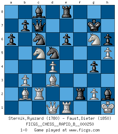 Last move : 1-0 2017 June 28 16:11:13 [Event "FICGS__CHESS__RAPID_B__000250"] [Site "FICGS"] [Date "2017.05.07"] [Round "1"] [White "Sternik,Ryszard"] [Black "Faust,Dieter"] [Result "1-0"] [WhiteElo "1780"] [BlackElo "1850"] 1.e4 e6 2.d4 d5 3.e5 f6 4.Bd3 g6 5.h4 c5 6.h5 g5 7.exf6 c4 8.f7+ Kxf7 9.Be2 Nc6 10.Nf3 h6 11.b3 cxb3 12.axb3 Bd6 13.O-O a6 14.Bb2 Kg7 15.Ne5 Nge7 16.Nd2 Rf8 17.Ndf3 Bd7 18.Nd3 Kh8 19.c4 Rc8 20.Nc5 Qc7 21.cxd5 Nxd5 22.Re1 Rce8 23.Bd3 Bc8 24.Rc1 g4 25.Nh4 Bh2+ 26.Kh1 Rxf2 27.Ng6+ Kg7 28.Rc2 1-0 French : Advance variation Kingside Castling by player White (move 13) Player White won this chess game. Follow this game move after move (download)Chess is as much a mystery as women. (Purdy) Der 70jährige Viktor Kortschnoi: Die Rentenanstalt wollte mich zwingen in Rente zu gehen. Meine Frau erhält jetzt eine Pension- und ich zahle weiter in die Rentenkasse ein! (Viktor Kortschnoi) No es suficiente ser un buen jugador, se debe también de jugar bién. (Siegbert Tarrasch) Pour moi, les échecs ne sont pas un jeu mais un art. (Alexandre Alekhine) Wisdom begins at the end. (Daniel Webster)