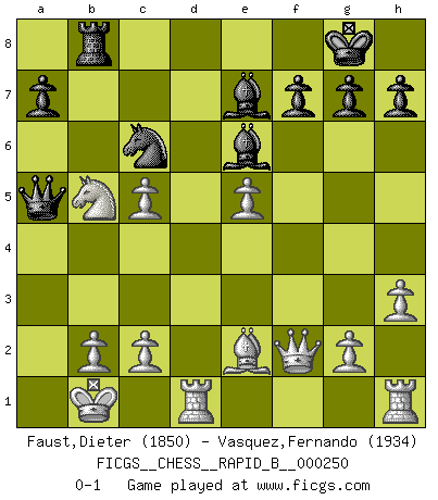 Last move : 0-1 2017 July 16 13:48:49 [Event "FICGS__CHESS__RAPID_B__000250"] [Site "FICGS"] [Date "2017.05.07"] [Round "1"] [White "Faust,Dieter"] [Black "Vasquez,Fernando"] [Result "0-1"] [WhiteElo "1850"] [BlackElo "1934"] 1.e4 e5 2.Nc3 Nf6 3.f4 d5 4.fxe5 Nxe4 5.Nf3 Be7 6.Qe2 Nxc3 7.dxc3 c5 8.Be3 O-O 9.O-O-O Nc6 10.Kb1 Be6 11.h3 Rc8 12.Qf2 Qa5 13.Bd2 b5 14.a3 d4 15.cxd4 b4 16.dxc5 Rfd8 17.Be2 Rxd2 18.Nxd2 bxa3 19.Nc4 Qb4 20.Nxa3 Rb8 21.Nb5 Qa5 0-1 Vienna gambit : Breyer variation Kingside Castling by player Black (move 8) Queenside Castling by player White (move 9) Player Black won this chess game. Follow this game move after move (download)Chess is above all, a fight ! (Emanuel Lasker) Ein unbeabsichtigtes Patt ist der Gipfel der Dummheit. (Anonymous) El poder defensivo de una pieza clavada, solamente es imaginario. (Aaron Nimzovich) Les Echecs, c'est l'art de la guerre sans les charniers, c'est la résurrection des morts tombés au champ d'honneur, l'espoir perpétuel, la suprématie de l'intelligence sur la force, la culture de l'esprit. (F. Szpiner) The human is the only animal species whose members are able to talk themselves into difficulties that would not otherwise exist. (Wendell Johnson)