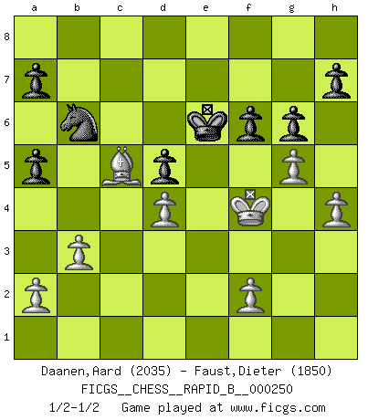 Last move : 1/2-1/2 2017 June 30 15:4:4 [Event "FICGS__CHESS__RAPID_B__000250"] [Site "FICGS"] [Date "2017.05.07"] [Round "1"] [White "Daanen,Aard"] [Black "Faust,Dieter"] [Result "1/2-1/2"] [WhiteElo "2035"] [BlackElo "1850"] 1.d4 Nf6 2.g3 e6 3.Bg2 c5 4.Nf3 Nc6 5.O-O Qb6 6.e3 Be7 7.c4 O-O 8.Nc3 d6 9.b3 Rd8 10.Bb2 cxd4 11.exd4 d5 12.Qe2 Bd7 13.Rfe1 Qa6 14.Rad1 Rac8 15.Ne5 Bb4 16.Nxd7 Rxd7 17.cxd5 Nxd5 18.Qxa6 bxa6 19.Nxd5 Bxe1 20.Rxe1 Rxd5 21.Bxd5 exd5 22.Rc1 f6 23.Rc5 Ne7 24.Ba3 Rxc5 25.Bxc5 Nc8 26.Kg2 Kf7 27.Kf3 Ke6 28.Kf4 g6 29.h4 a5 30.g4 Nb6 31.g5 1/2-1/2 Queen's pawn game Kingside Castling by player White (move 5) Kingside Castling by player Black (move 7) This chess game ended in a draw. Follow this game move after move (download)Up to this point White has been following well-known analysis. But now he makes a fatal error: he begins to use his own head. (Siegbert Tarrasch) Ihnen, Herr Lasker, habe ich nur drei Worte zu sagen: Schach und matt. (Siegbert Tarrasch) El Ajedrez es tan inspirador que yo no creo que un buen jugador sea capaz de tener un pensamiento malo durante una partida. (Wilhelm Steinitz) Toutes choses étant égales, c'est la conviction qui gagne. Alliée à une volonté de vaincre, elle sert de détonateur, suscite des idées, disperse les doutes et aide à penser clairement. (Robert Fischer) Looking at the proliferation of personal web pages on the Net, it looks like very soon everyone on Earth will have 15 megabytes of fame. (M.G. Sriram)