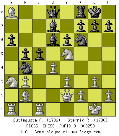 Last move : 1-0 2017 June 7 13:18:13 [Event "FICGS__CHESS__RAPID_B__000250"] [Site "FICGS"] [Date "2017.05.07"] [Round "1"] [White "Duttagupta,Aniruddha"] [Black "Sternik,Ryszard"] [Result "1-0"] [WhiteElo "1786"] [BlackElo "1780"] 1.d4 Nf6 2.c4 e6 3.g3 d5 4.Nf3 dxc4 5.Bg2 a6 6.O-O Nc6 7.e3 Bd7 8.Qe2 b5 9.b3 cxb3 10.axb3 Bd6 11.Bb2 O-O 12.Rc1 Nb4 13.Ne5 c6 14.Na3 c5 15.Bxa8 1-0 Catalan Opening Kingside Castling by player White (move 6) Kingside Castling by player Black (move 11) Player White won this chess game. Follow this game move after move (download)Could we look into the head of a Chess player, we should see there a whole world of feelings, images, ideas, emotion and passion. (Alfred Binet) Die größte Kunst beim Schach besteht darin dem Gegner nicht zu zeigen was er tun kann. (Garry Kasparov) EL Ajedrez es como la vida. (Boris Spassky) Karpov est une pièce de musée. (Garry Kasparov) Have no fear of perfection - you'll never reach it. (Salvador Dali)