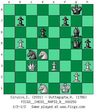 Last move : 1/2-1/2 2017 September 7 20:4:24 [Event "FICGS__CHESS__RAPID_B__000250"] [Site "FICGS"] [Date "2017.05.07"] [Round "1"] [White "Cirulis,Ilmars"] [Black "Duttagupta,Aniruddha"] [Result "1/2-1/2"] [WhiteElo "2031"] [BlackElo "1786"] 1.b4 e5 2.a3 d5 3.Bb2 Nd7 4.c4 dxc4 5.e3 Ngf6 6.Bxc4 Bd6 7.Nc3 O-O 8.Rc1 Nb6 9.Be2 a5 10.b5 Qe7 11.Nf3 e4 12.Nd4 Bxa3 13.Bxa3 Qxa3 14.O-O Re8 15.d3 exd3 16.Qxd3 Qd6 17.Qc2 a4 18.Ra1 a3 19.h3 g5 20.Rfd1 h5 21.Nf3 Qc5 22.Rac1 Re6 23.Nd4 Rd6 24.Qb3 Qe5 25.Ra1 Bd7 26.Rxa3 Rxa3 27.Qxa3 g4 28.Bf1 g3 29.Qa2 Qg5 30.Nf3 Qc5 31.Rxd6 cxd6 32.Nd1 Ne4 33.Qb3 Be6 34.Qd3 Bf5 35.Nd4 Bg6 36.fxg3 Nxg3 37.Qd2 Nxf1 38.Kxf1 Nc4 39.Qe1 Qg5 40.Qc3 1/2-1/2 Polish (Sokolsky) opening Kingside Castling by player Black (move 7) Kingside Castling by player White (move 14) This chess game ended in a draw. Follow this game move after move (download)One of these modest little moves may be more embarrassing to your opponent than the biggest threat. (Siegbert Tarrasch) Wenn ich einen Club besuche, sind die Spieler stumm vor Staunen. (José Raúl Capablanca) Un mal plan es mejor que no tener ningún plan. (Frank Marshall) Il vaut mieux sacrifier les pièces de l'adversaire. (Xavier Tartacover) It's not the size of the dog in the fight, it's the size of the fight in the dog. (Mark Twain)