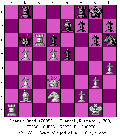 Last move : 1/2-1/2 2017 May 18 23:41:34 [Event "FICGS__CHESS__RAPID_B__000250"] [Site "FICGS"] [Date "2017.05.07"] [Round "1"] [White "Daanen,Aard"] [Black "Sternik,Ryszard"] [Result "1/2-1/2"] [WhiteElo "2035"] [BlackElo "1780"] 1.e4 c5 2.Nf3 d6 3.d4 cxd4 4.Nxd4 Nf6 5.Nc3 a6 6.g3 e5 7.Nb3 Be7 8.Bg2 O-O 9.O-O Be6 10.a4 Nbd7 11.Re1 Rc8 12.Nd2 Bg4 13.Bf3 Bxf3 14.Qxf3 Nc5 15.b3 Ne6 16.Bb2 Nd4 17.Qd3 b5 18.axb5 axb5 19.Rec1 Qb6 20.Nd5 Nxd5 21.exd5 g6 22.c4 Nf5 23.h4 Nh6 24.cxb5 Rb8 25.Rc6 1/2-1/2 Sicilian : Najdorf, Zagreb (Fianchetto) variation Kingside Castling by player Black (move 8) Kingside Castling by player White (move 9) This chess game ended in a draw. Follow this game move after move (download)Not only will I predict his triumph over Botvinnik, but I'll go further and say that he'll probably be the greatest Chess player that ever lived. (John Collins) Der beste Spieler in einem Turnier gewinnt es nie. Er landet auf Platz zwei oder drei. (Siegbert Tarrasch) El Ajedrez tiene tanto misterio como las mujeres. (Purdy) Les échecs sont un jeu terrible. Si vous n'avez pas le centre, votre adversaire a une position plus libre. Par contre, si vous avez le centre, alors vous avez vraiment quelque chose pour laquelle vous inquiéter ! (Siegbert Tarrasch) God is an atheist. (Unknown)
