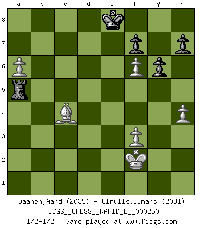 Last move : 1/2-1/2 2017 August 5 21:57:37 [Event "FICGS__CHESS__RAPID_B__000250"] [Site "FICGS"] [Date "2017.05.07"] [Round "1"] [White "Daanen,Aard"] [Black "Cirulis,Ilmars"] [Result "1/2-1/2"] [WhiteElo "2035"] [BlackElo "2031"] 1.f4 e6 2.Nf3 Be7 3.e3 Nh6 4.d4 d5 5.Bd3 c5 6.dxc5 Bxc5 7.O-O O-O 8.Nc3 a6 9.Qe1 Nc6 10.a3 Bd7 11.b4 Ba7 12.Kh1 Rc8 13.Rb1 Ne7 14.b5 axb5 15.Nxb5 Bc5 16.Ne5 Bxb5 17.Bxb5 Rc7 18.c4 Nhf5 19.a4 Nd6 20.cxd5 exd5 21.Nd3 b6 22.Bd2 Qc8 23.a5 Qe6 24.Nxc5 bxc5 25.Bd3 c4 26.Bc2 c3 27.Bxc3 Rfc8 28.f5 Qd7 29.Rb3 d4 30.exd4 Nd5 31.Rf3 Qe8 32.Qa1 Rc4 33.f6 g6 34.h3 Nb5 35.Rxb5 Qxb5 36.Bd3 Nxc3 37.Qxc3 Rxc3 38.Bxb5 Rxf3 39.gxf3 Rd8 40.Bc6 Rxd4 41.a6 Rd1+ 42.Kg2 Ra1 43.Bb5 Kf8 44.h4 Ra5 45.Bd3 Ke8 46.Kg3 Kd7 47.Bc4 Ke8 48.Kf2 1/2-1/2 Bird's Opening Kingside Castling by player White (move 7) Kingside Castling by player Black (move 7) This chess game ended in a draw. Follow this game move after move (download)If cunning alone were needed to excel, women would be the best Chess players. (Albin) Fischer: 'Remis!?' Uhlmann: 'Aber es muss doch dreimal Zugwiederholung sein!' Fischer: 'Sie nehmen das Remis an, wie ich es sage, sonst spiele ich weiter und werde Sie dann schlagen!' (Robert James Fischer) Jugadores de primera clase pierden en contra de jugadores de segunda clase porque los jugadores de segunda clase a veces juegan una partida de primer clase. (Siegbert Tarrasch) Avant la finale, les dieux ont créé le milieu de partie. (Tarrasch) A good book on your shelf is a friend that turns its back on you and remains a friend. (Author unknown)